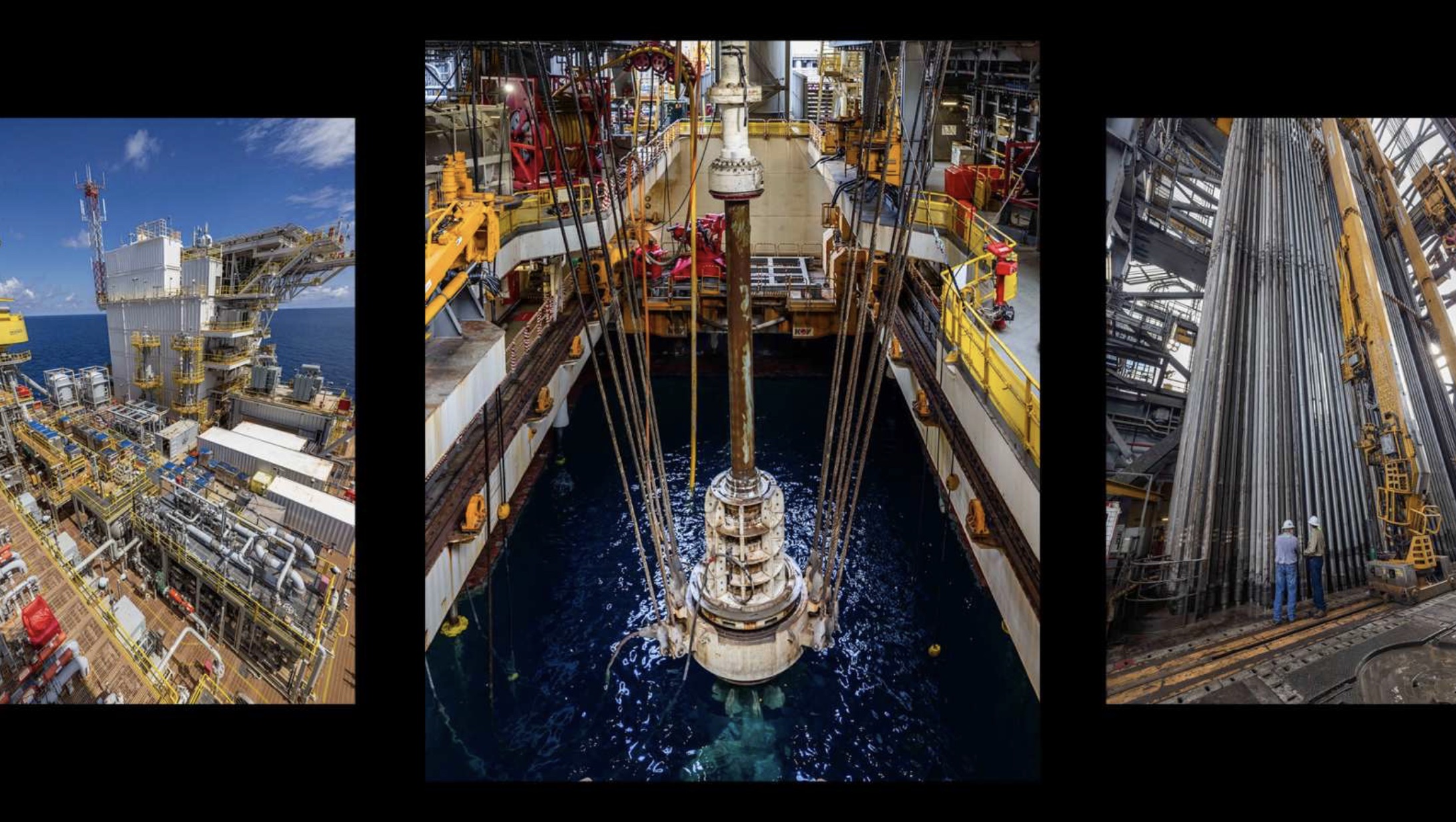 A bordo de la plataforma petrolífera Anchor de Chevron, que opera en coordinación con un buque de tamaño similar al de un portaaviones y que perora pozos para acceder a yacimientos situados a seis millas bajo la superficie del agua.