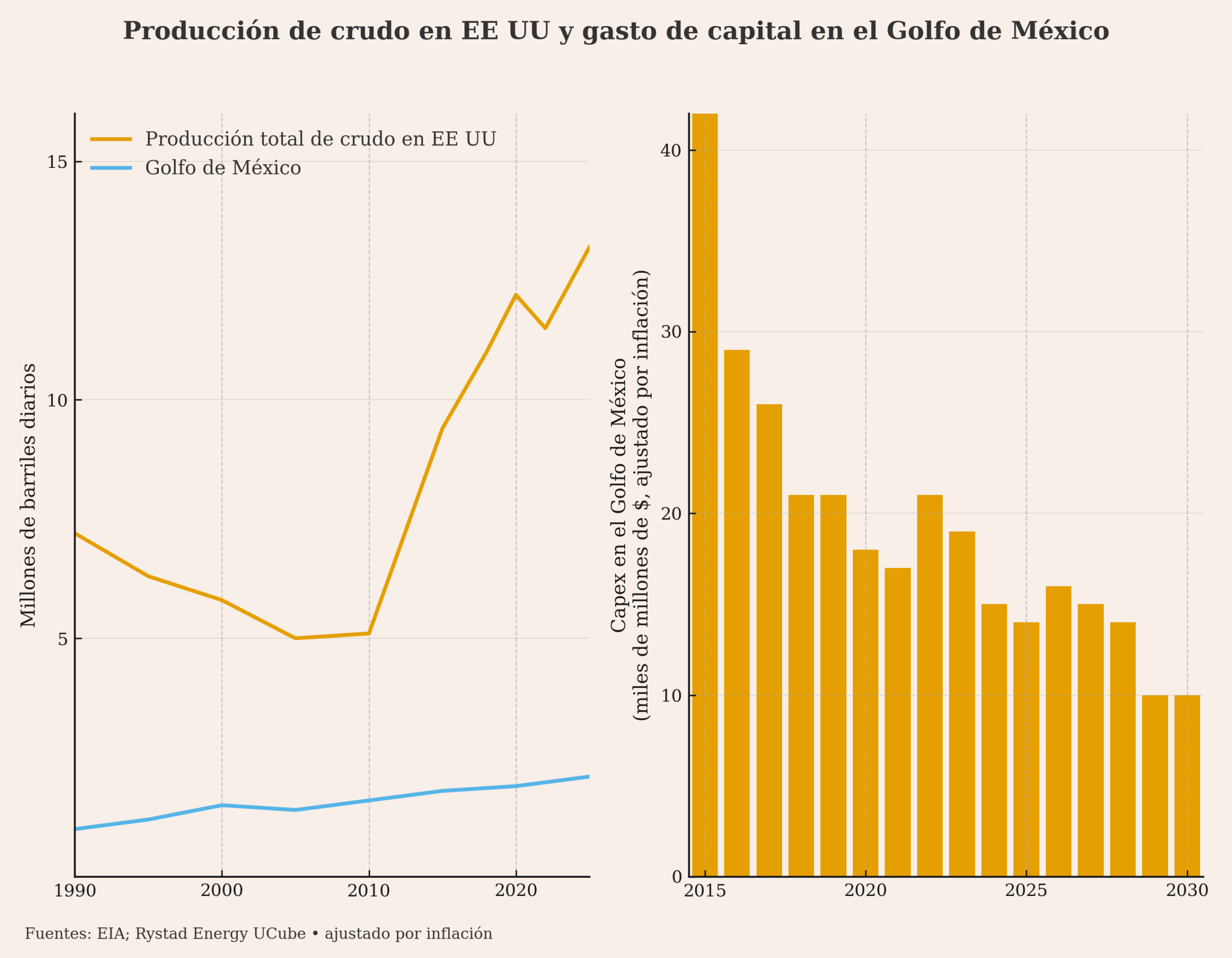 La revitalización del golfo podría ser vital para mantener la posición de Estados Unidos como el mayor productor mundial de petróleo y gas, dado que se prevé que la producción petrolera en tierra caiga en 2026, cuando los productores de petróleo de esquisto —más costoso— reduzcan la inversión en respuesta a la caída de los precios.