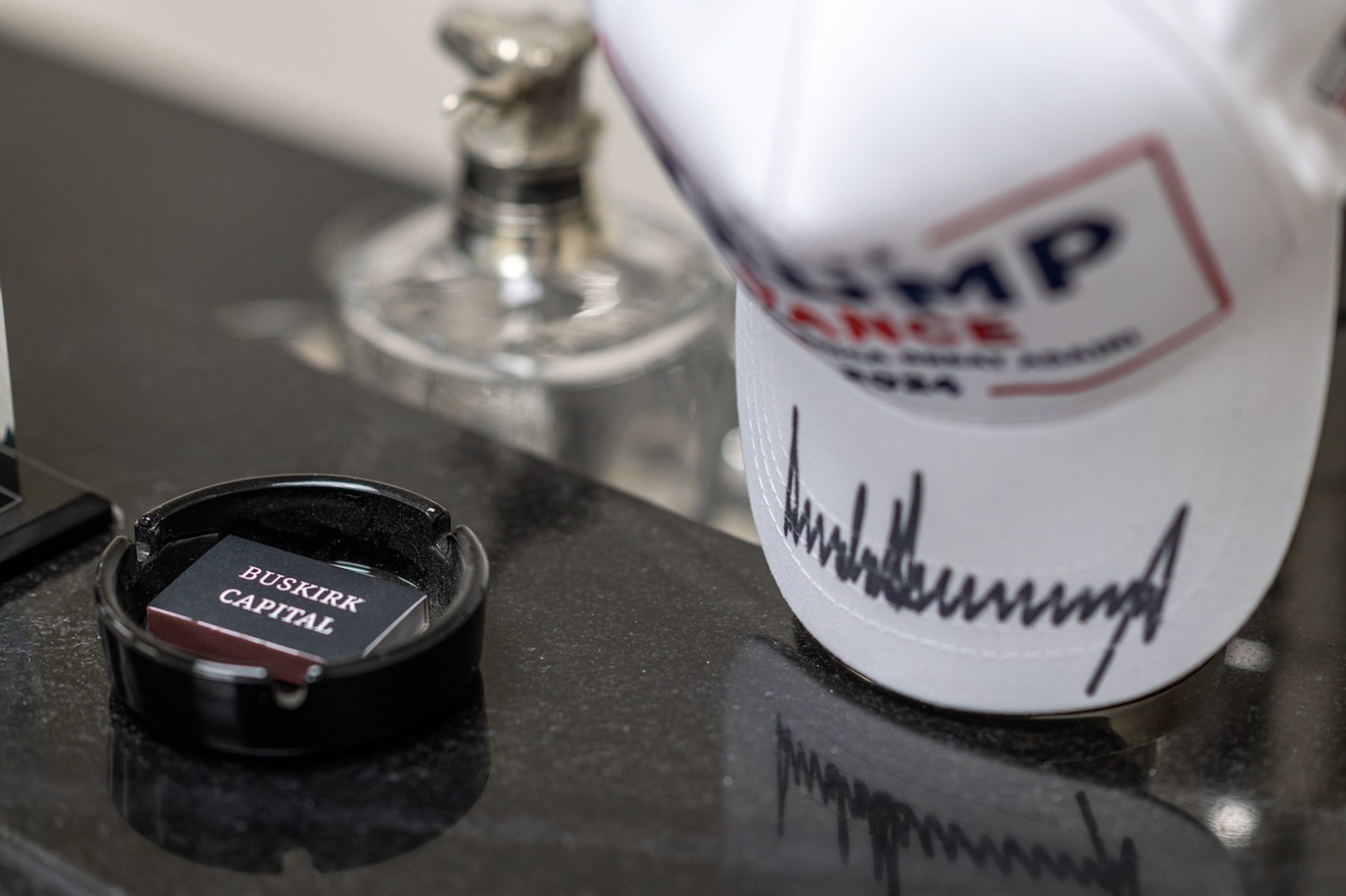 Objetos de memorabilia política componen buena parte de la escasa decoración en Buskirk Capital. (Ash Ponders / The Washington Post).