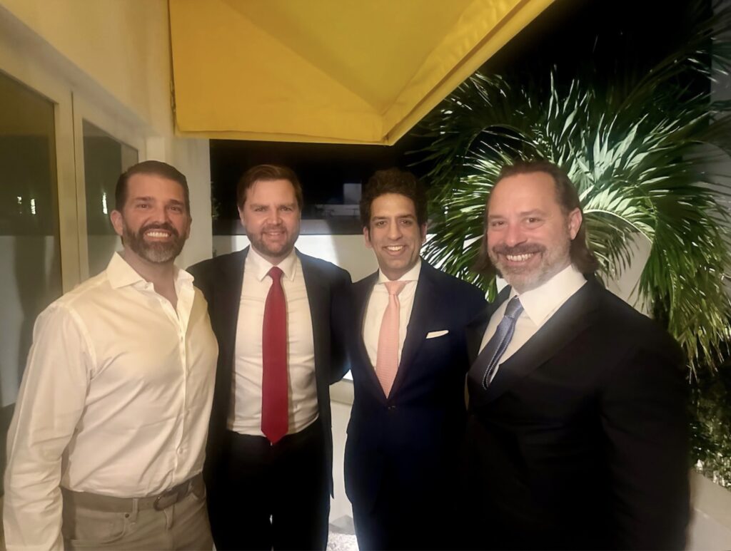 De izquierda a derecha, Donald Trump Jr., JD Vance, Omeed Malik y Chris Buskirk se reúnen en Palm Beach pocos días antes de la segunda investidura de Trump. (The Washington Post).