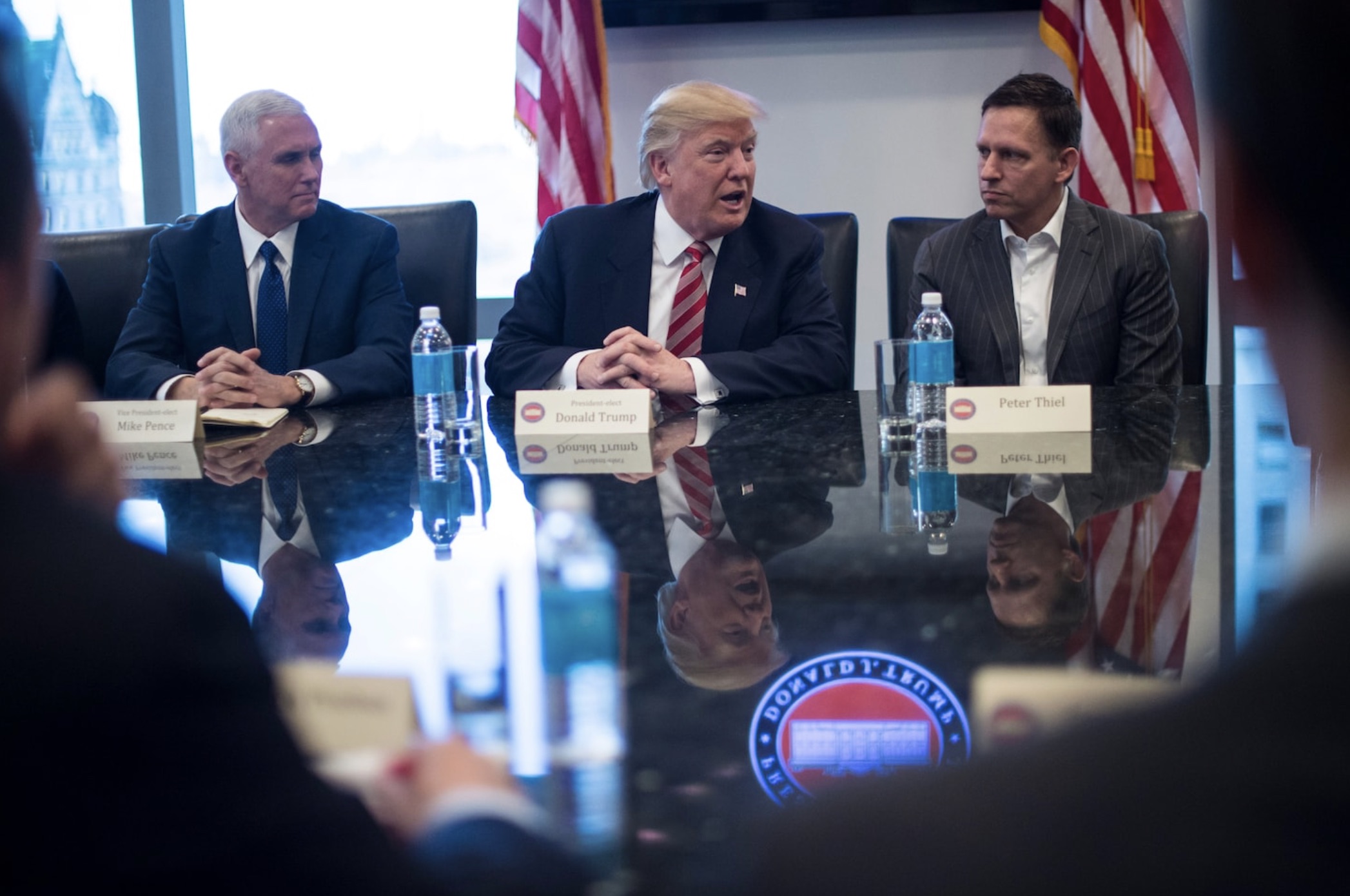 El vicepresidente electo Mike Pence (izquierda) y el fundador de PayPal, Peter Thiel, escuchan al presidente electo Donald Trump durante una reunión con líderes del sector tecnológico en la Trump Tower de Nueva York, en 2016. (Jabin Botsford / The Washington Post).