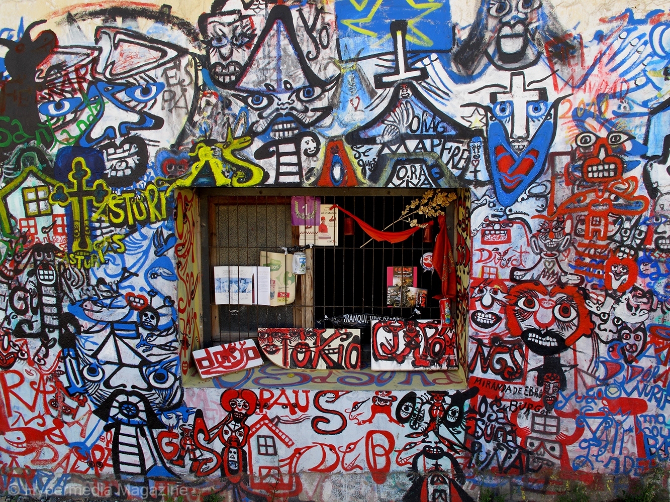 Utiliza además cuadernos que llena con textos y bocetos a lápices de colores. Son nuevas composiciones que a veces encuentras reproducidas sobre los muros. Los cuadernos, abiertos por las páginas dibujadas, se exponen periódicamente en las rejas y ventanas del edificio, junto a los paneles de madera y otros efectos personales, que se integran a las pinturas murales de la fachada.