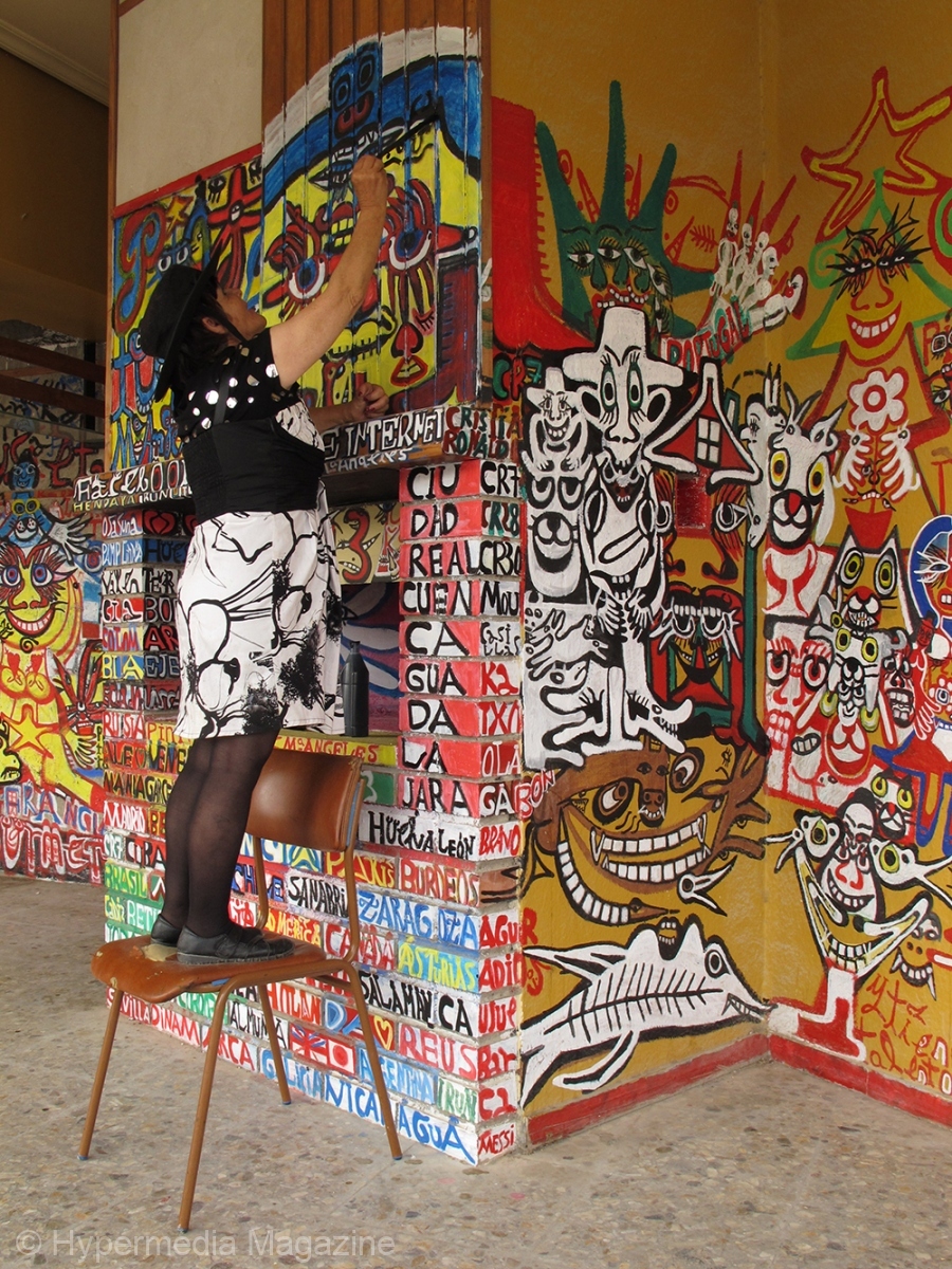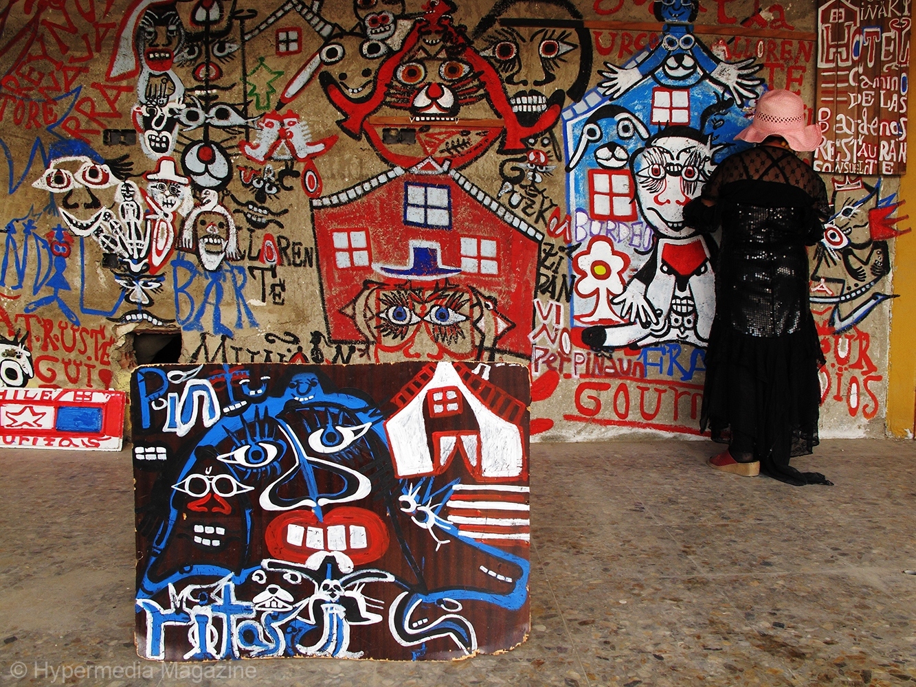 En mi primer regreso, en 2010, me sorprendió constatar que casi todas las pinturas y dibujos fotografiados en 2009 habían desaparecido. La artista los había modificado con nuevas aportaciones o los había sustituido por otras. El fenómeno volvió a producirse en 2011 y así sucesivamente. Por lo que, en cada encuentro, disfruto in situ de una “muestra renovada”, que La Pinturitas, como si fuera la guía de su propio museo, suele explicar en detalles y con la mayor pasión.