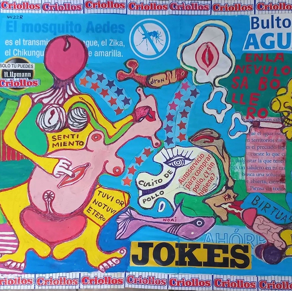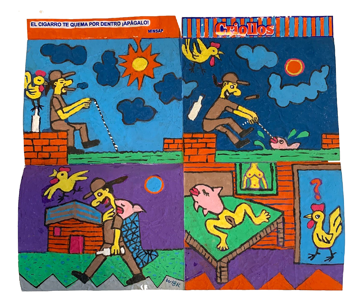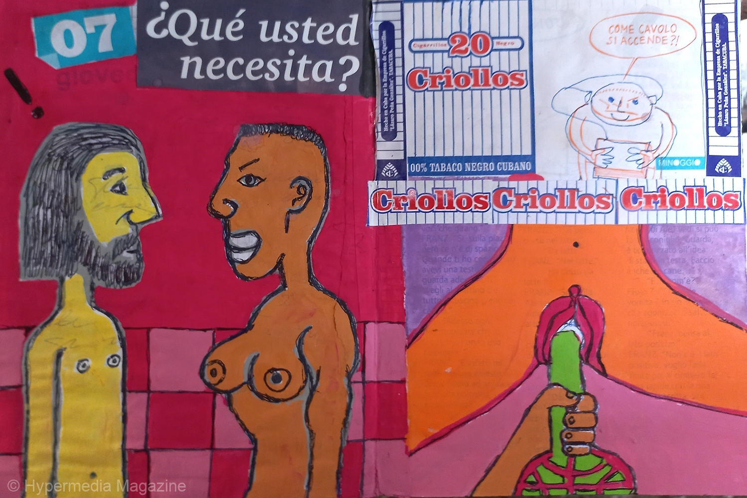 Empleo también las etiquetas de comida para insinuar el hambre que hay detrás. Y luego utilizo colores vivos para enfatizar las historias que cuento. Creo que con ellos logro sustituir los diálogos que tradicionalmente se usan en las historietas mediante globos y textos. A través de los colores, objetos y la misma sexualidad, trato de hacer llegar el mensaje que quiero.