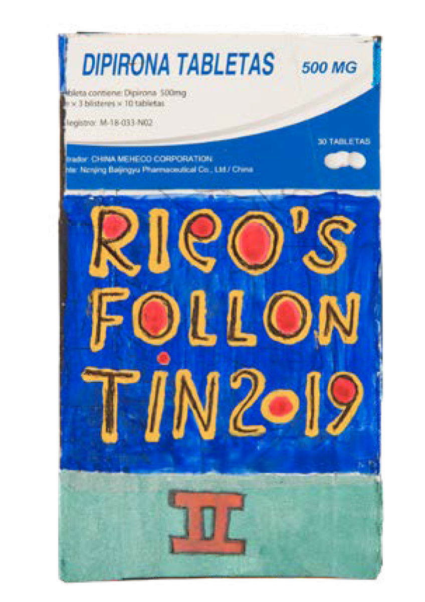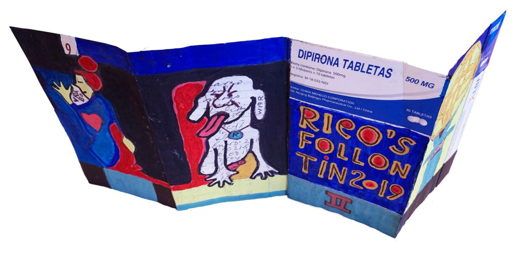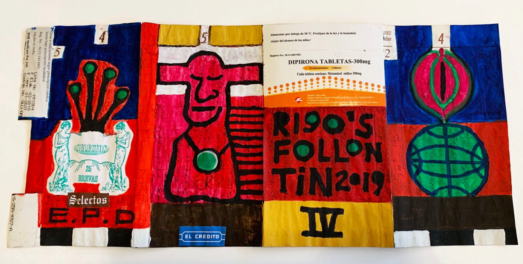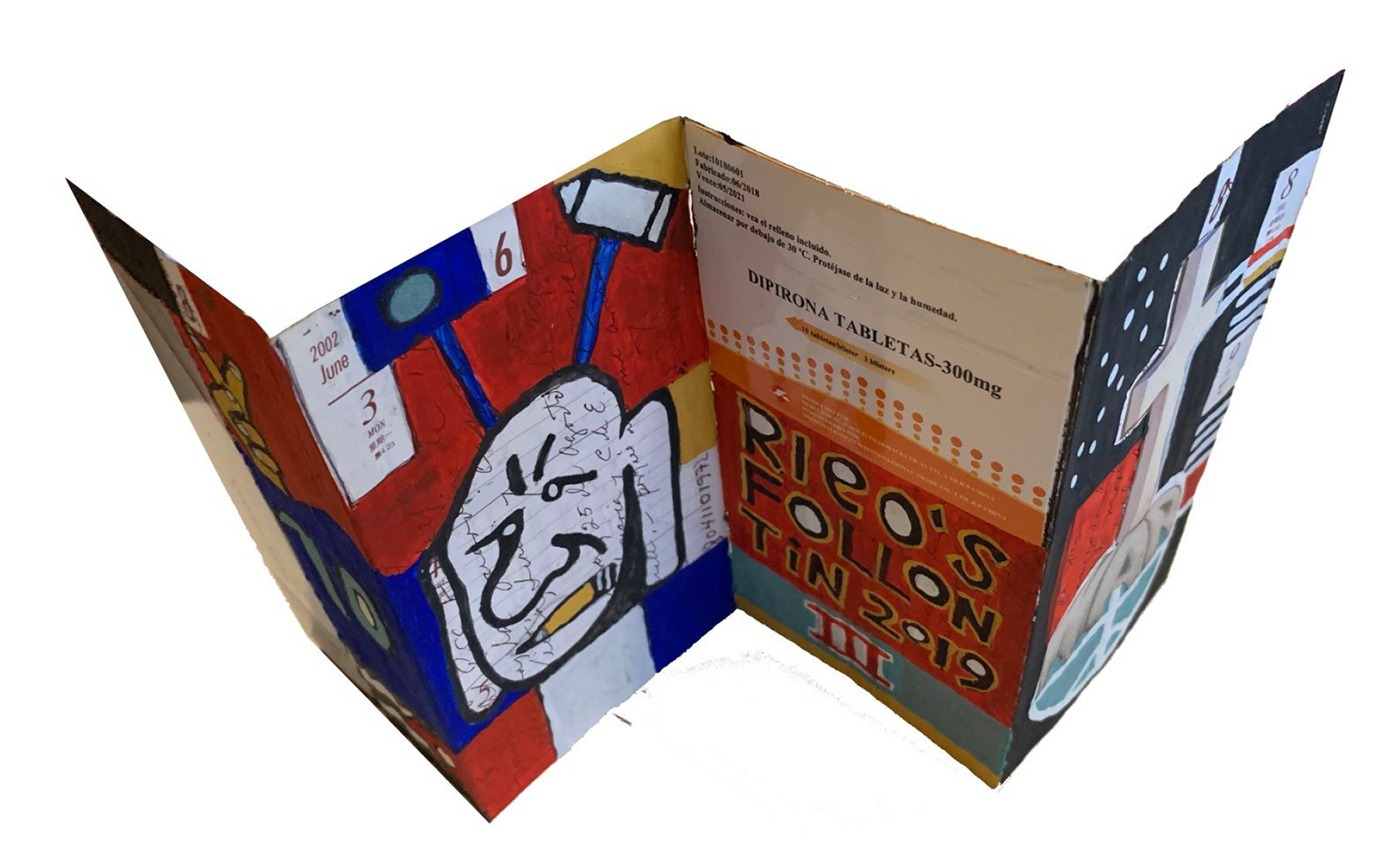 Utilizo todo el material que pueda reciclar para trabajar. Los cartones que uso de los envases de medicamentos y de comida me sirven porque están a la mano, los puedo encontrar en cualquier sitio. De algún modo, estoy mostrando mi propio entorno con todas las carencias, sumadas a mis situaciones particulares y las de otras personas.