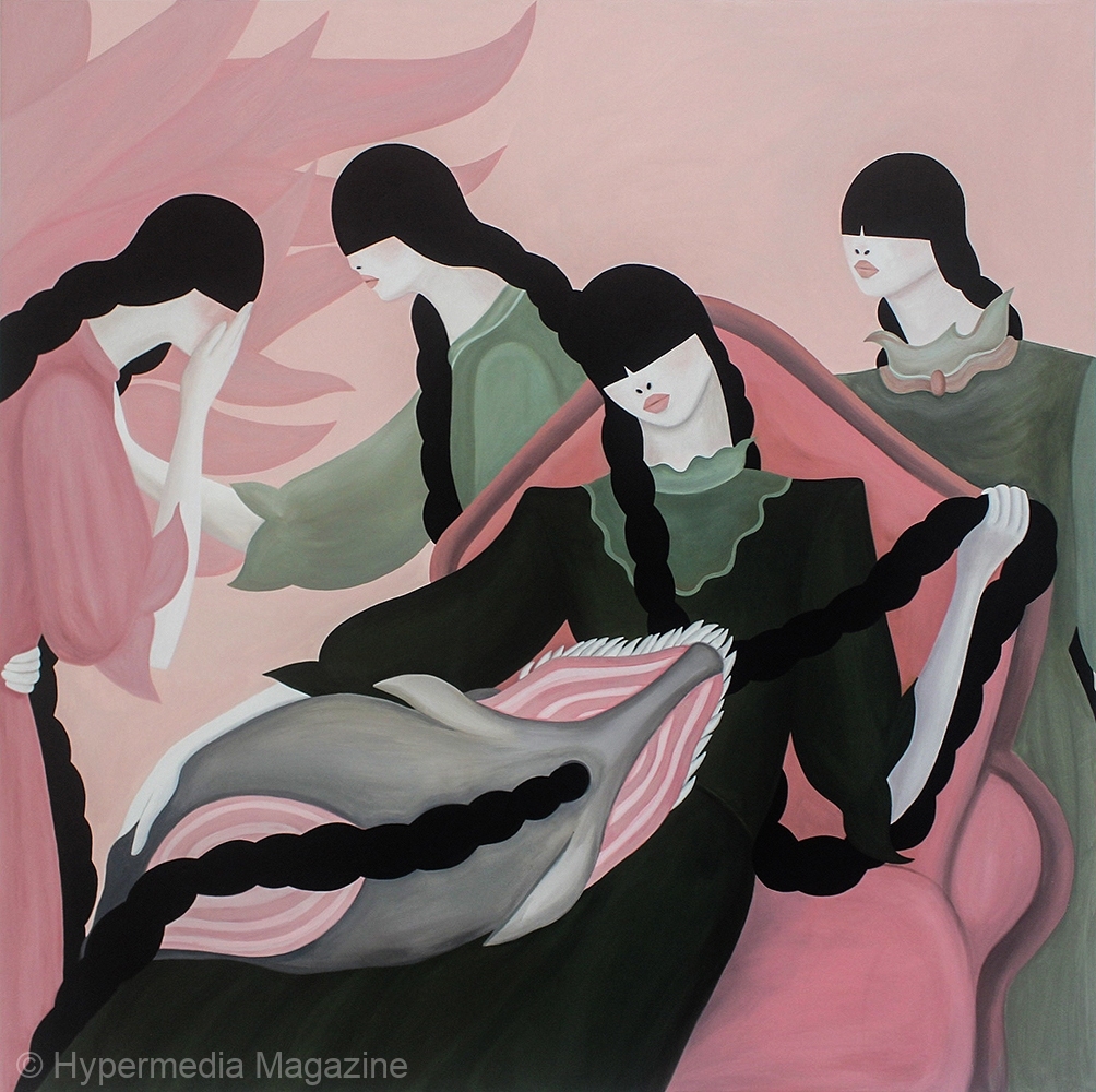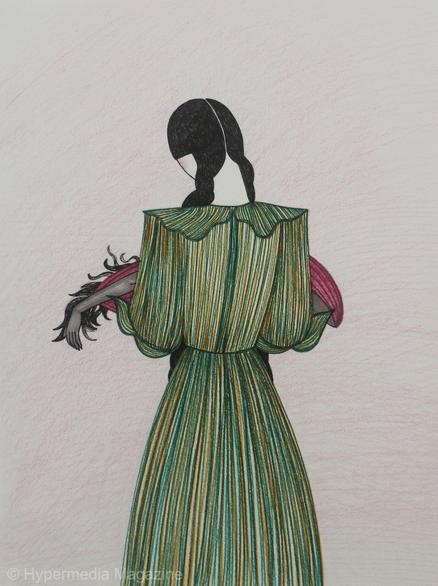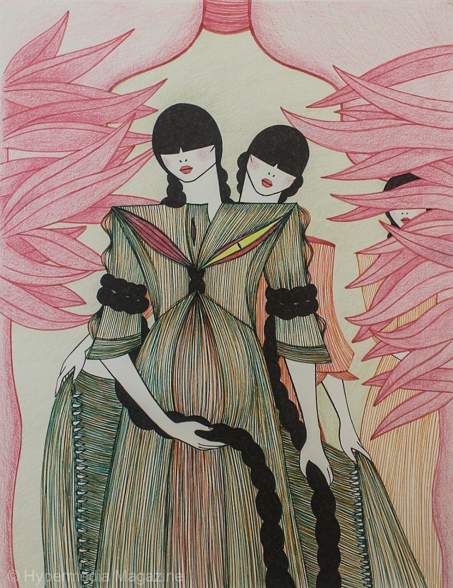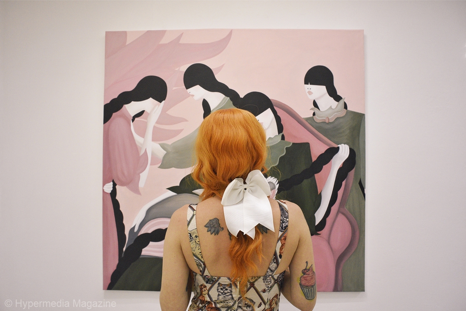 Más allá de la reiterada androginia, los prototipos que invitan al ‘Baby Shower’ lucen una máscara colectiva que nos impide ver directamente a sus ojos. La mirada se encuentra protegida detrás de un elemento del peinado. De esta forma, son criaturas que se resisten al reconocimiento facial, que permanecerán en nosotros como sujetos inclasificables.