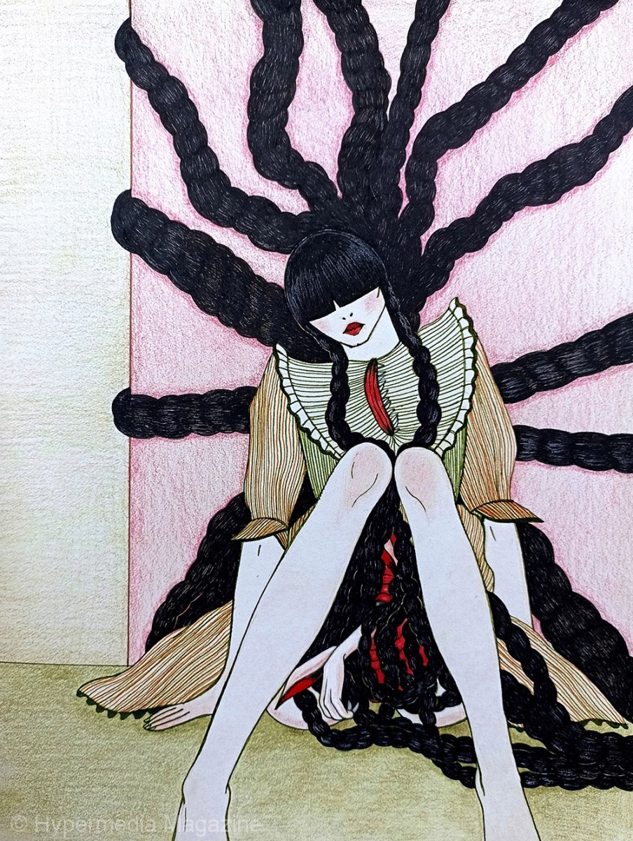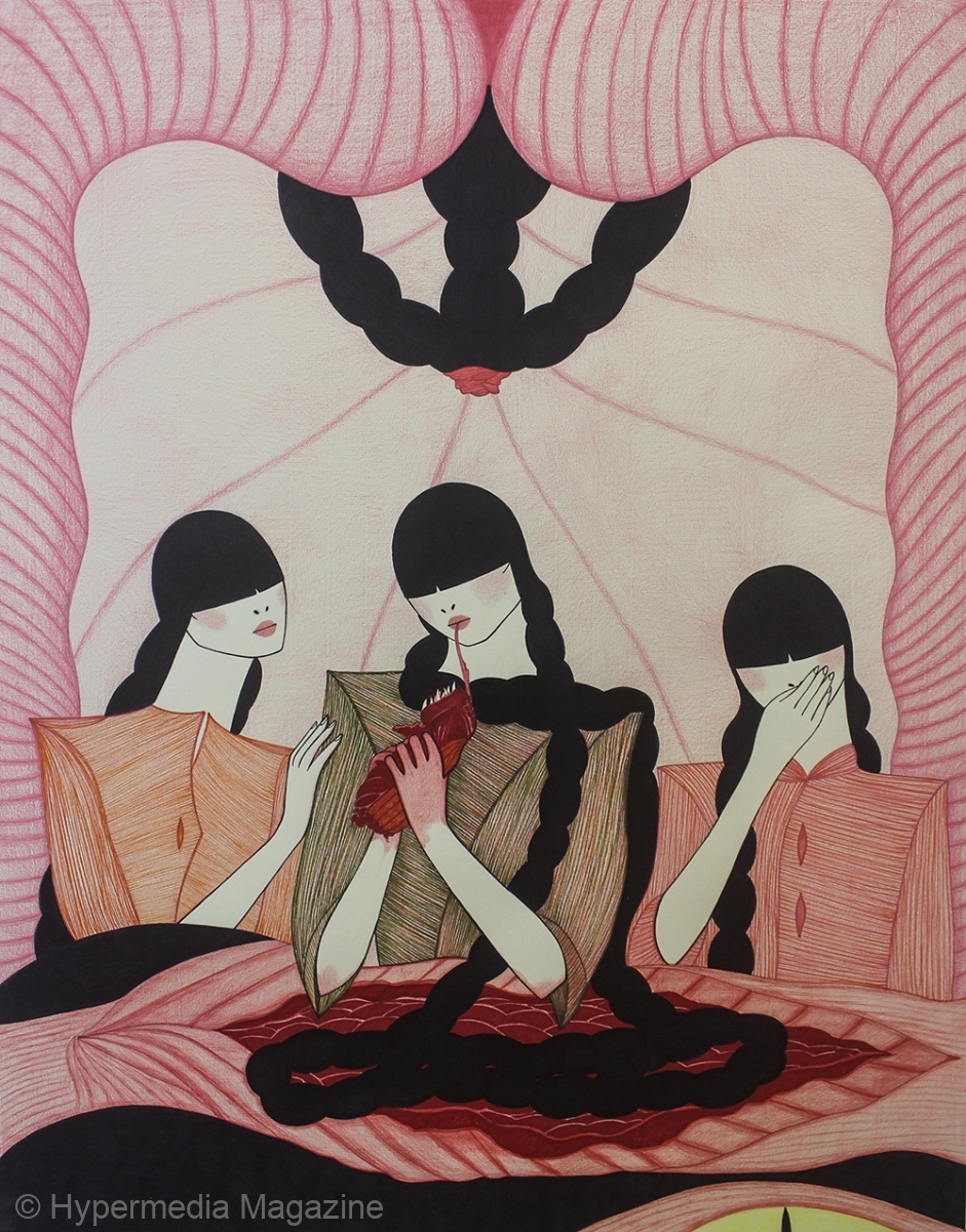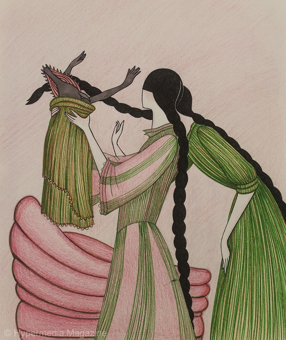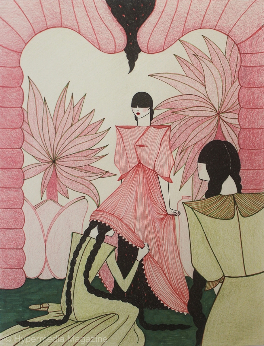 Más allá de la reiterada androginia, los prototipos que invitan al ‘Baby Shower’ lucen una máscara colectiva que nos impide ver directamente a sus ojos. La mirada se encuentra protegida detrás de un elemento del peinado. De esta forma, son criaturas que se resisten al reconocimiento facial, que permanecerán en nosotros como sujetos inclasificables.