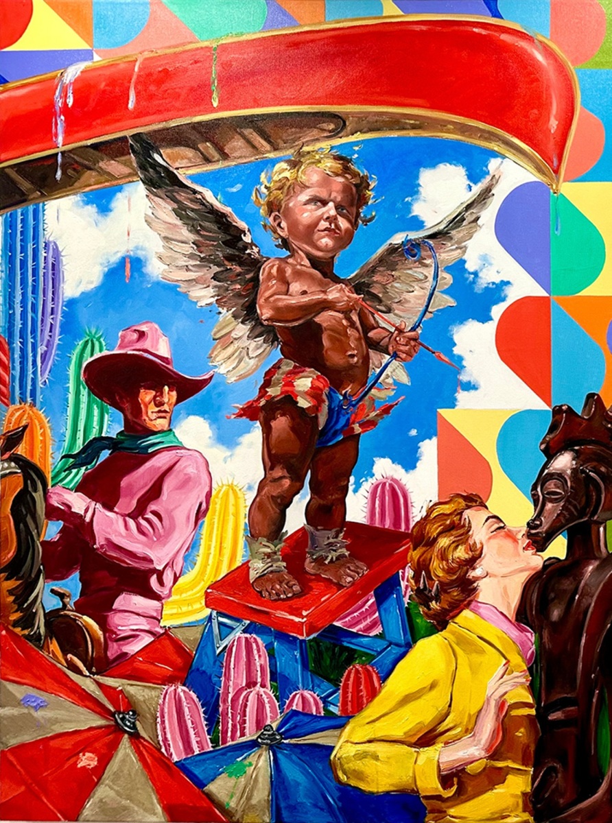 La impresión de entrada perturba. Ante nuestros ojos desfila un carnaval de imágenes: héroes y heroínas Pulp, zorros y ranas de fábula, patrones abstractos geométricos de mediados del siglo XX, Cupidos renacentistas y fisiculturistas, máscaras y estatuas tribales, cactus rosados y amarillos, astronautas, golfistas, niños uniformados, estatuas grecolatinas, torbellinos enlatados, muñecos de nieve negros y mucho más. Todo junto y, a menudo, interactuando.