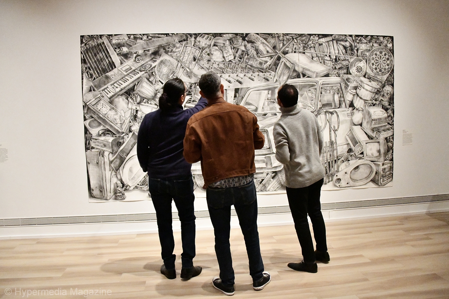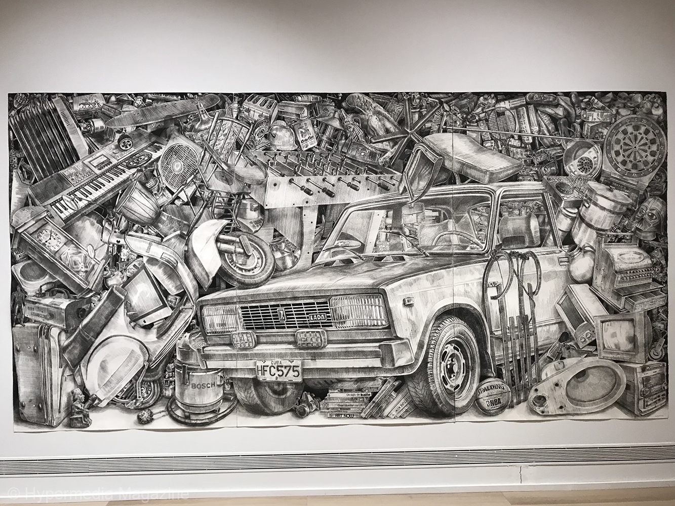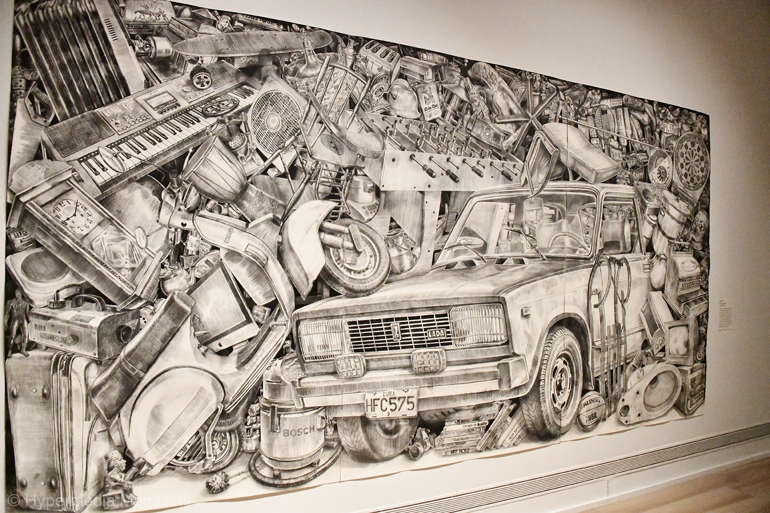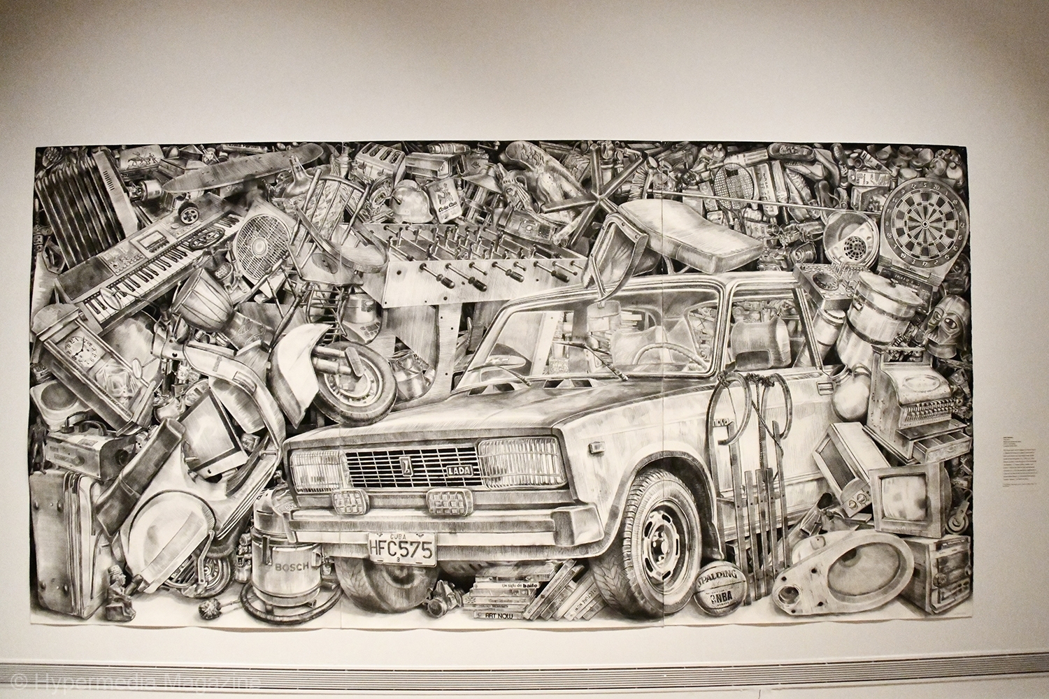 La presente muestra de Jairo Alfonso, Objectscapes, incluye dos de sus obras más logradas de ese período. La primera es “362”, un dibujo inmenso (78.7 x 159 pulgadas) más atestado que el Arca de Noé. Un Lada soviético domina la escena; pero “domina” quizás no es el verbo preciso: el Lada aparece atiborrado y casi aplastado por sus 361 compañeros de viaje. Es un cuadro de sus primeros años de estancia en España. Por coincidencia o designio —¿cuál es la diferencia?—, los hitos y giros de su obra parecen un espejo de su circunstancia personal.