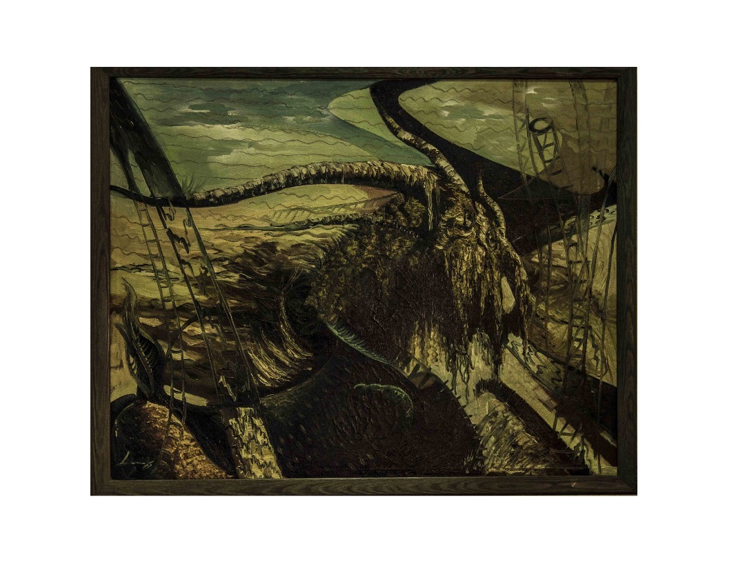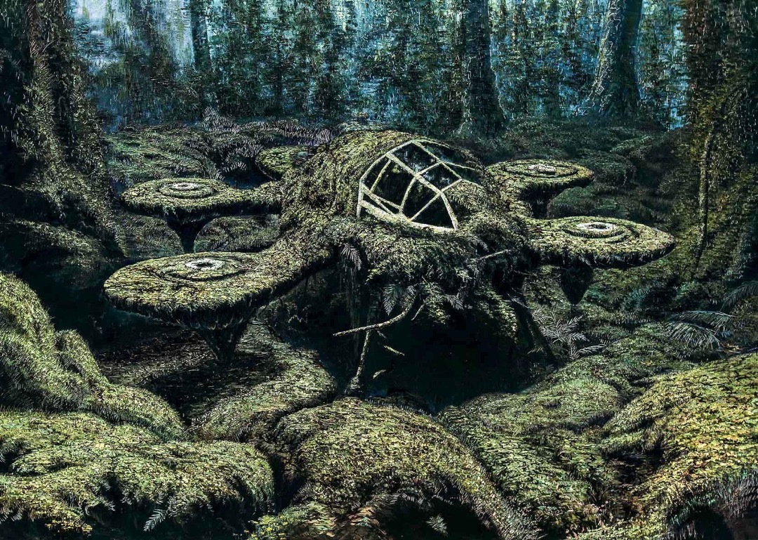 La figura del bosque —como en sus pinturas densas, húmedas, casi imposibles de atravesar— parece remitir al inconsciente, a la zona salvaje del alma donde se esconden las memorias más primitivas. Y de pronto, en medio de esa selva, una nave espacial (como en la obra Arrival) abre una grieta entre universos: lo terrenal y lo cósmico, lo ancestral y lo futurista, lo natural y lo artificial.