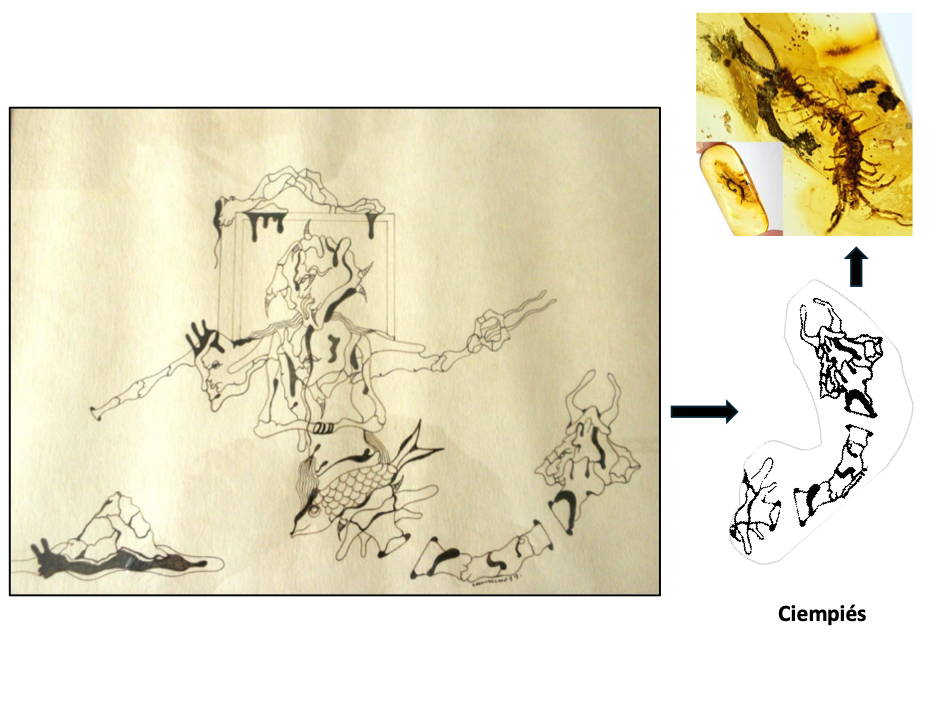 Obra 1. Sin título. Tinta sobre papel, 1979. Dimensiones: 20 x 30 cm. La representación de un ciempiés junto con otros organismos incluidos los humanos ilustran la actividad predadora de estos artrópodos. La inclusión fósil corresponde a un ciempiés en ámbar del Báltico (Eoceno, 34-56 millones de años).