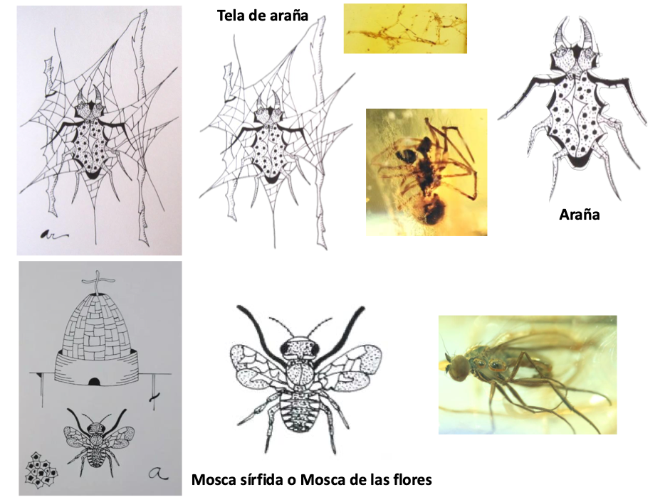 Obra 4. Rêves d’insectes. Litografía. Ref. (4). La relación típica entre las arañas y las moscas es entre depredador y presa. Sin embargo, en algunos casos puede haber relaciones comensales con beneficios para ambos organismos. Las inclusiones fósiles corresponden a una araña y a una tela de araña (Ref. 17) en ámbar de Myanmar (Cretáceo, ca. 99 millones de años) y a una mosca en ámbar del Báltico (Eoceno, 34-56 millones de años).