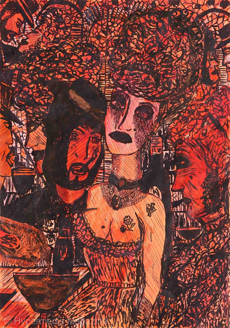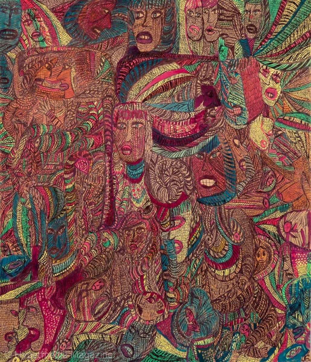 En la mente no tengo un dibujo programado. Nunca he hecho boceto. Dibujo directo y que salga lo que salga. Sencillamente empiezo a hacer unas imágenes y de pronto, cuando voy a mitad del dibujo, digo: “Esto es ‘La Matrona y sus niñas trabajadoras’. Este otro se llama ‘Hundimiento inevitable de un reinado corrupto’. Este otro: ‘Cleopatra rodeada de sus amantes soldados’. Este, ‘Sacerdocio’, y este se lo dediqué a Yemayá, a Olukun…”.