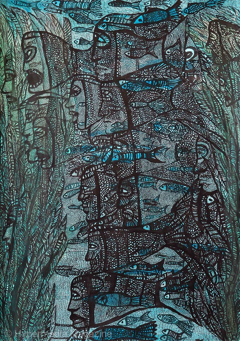 Mira este, como si lo rodearan peces peligrosos. Eso es el miedo que yo siento. Cuando tengo crisis de pánico, me pongo a pintar y se me quita. Me pongo a analizar todo lo que me ha salido mal de madrugada. Y me pongo a pintar de nuevo.