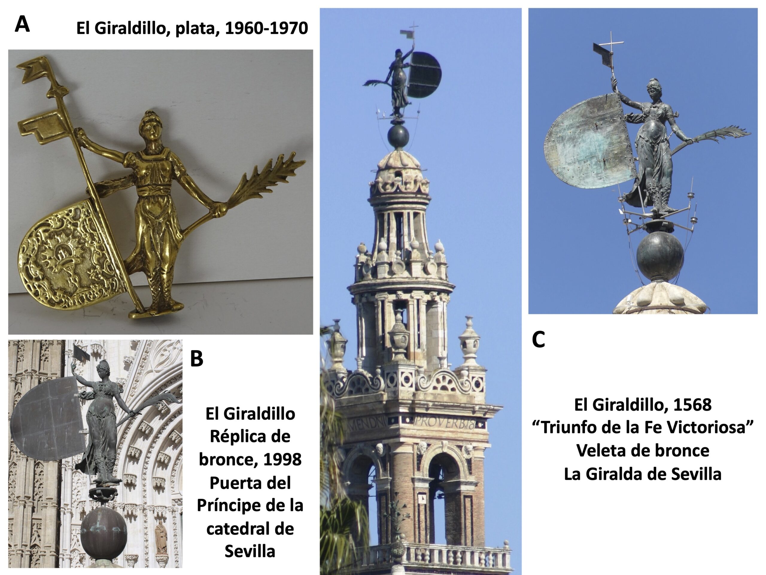 El Giradillo de Sevilla. (A) El Giraldillo de Sevilla, plata dorada, España, 1960-1970, 7.5 x 2.0 x 2.0 cm, 33 g. (B) La réplica de bronce de El Giraldillo en la Puerta del Príncipe de la Catedral de Sevilla, 1998. (C) El Giraldillo original de 1568 en la veleta de La Giralda de Sevilla. “Triunfo de la Fe Victoriosa”. Veleta de bronce. La Giralda de Sevilla.