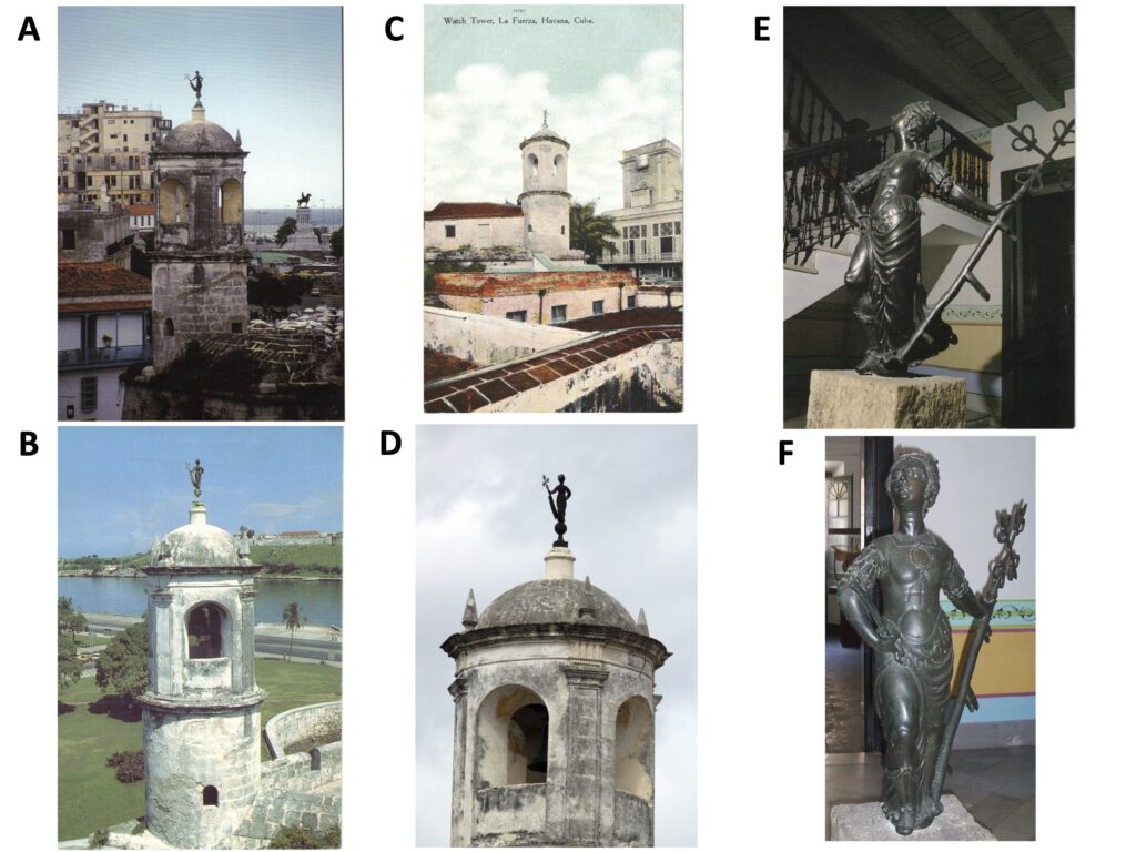 La Giraldilla de La Habana. (A) Postal. Giraldilla. Emblema de la Ciudad de La Habana. Fotos: J. Larramendi. Diseño: Juank. Imprime: Escandón Impresores, Sevilla, España. Editorial SI-MAR S.A. (B) Postal. Cuba – Habana Colonial. La Giraldilla, Torre del Homenaje. Impreso en Cuba por Coprefil, 01-17. (C) Tarjeta postal. República de Cuba. Union Postale Universelle. Published by Harris Bros. Co. Havana, Cuba, 1953. (D) Fotografía de La Giraldilla en la cúpula del Castillo de la Real Fuerza en La Habana, 2023. (E) Postal “La Giraldilla, Veleta de los Vientos”, El Castillo de la Real Fuerza, Primera E. R. en La Habana 1630-1634. Autor Gerónimo Martín Pinzón. Reverso con firma del antiguo propietario. (F) Fotografía de La Giraldilla en el Museo de la Ciudad de La Habana (Palacio de los Capitanes Generales).