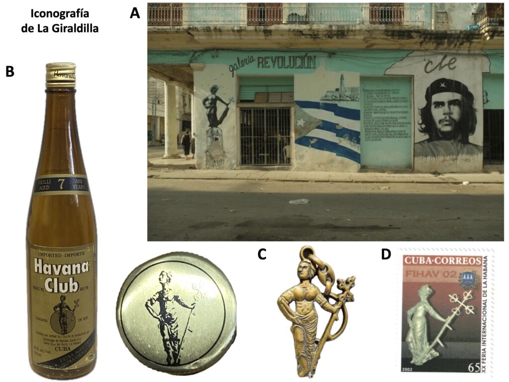 Iconografía de La Giraldilla de La Habana. (A) Botella de ron Havana Club, 7 años añejo. Fundada en 1878. Destilado y embotellado por Combinado de Bebidas Santa Cruz, Santa Cruz del Norte, La Habana, Cuba. (B) Foto de calle de La Habana. (C) Llavero de metal, Giraldilla de La Habana. (D) Sello postal. XX Feria Internacional de La Habana, FIHAV’02, 2002, 65 centavos.