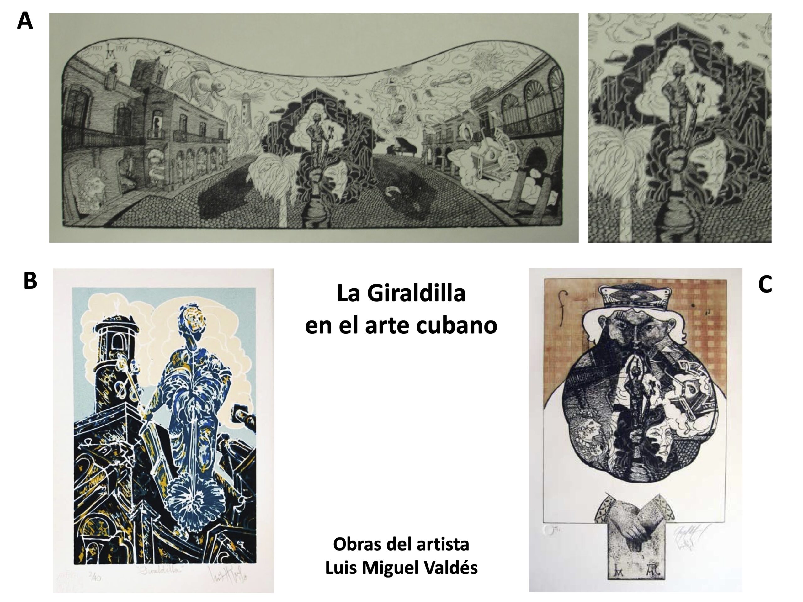 La Giraldilla de La Habana en el arte cubano-representada en obras del artista Luis Miguel Valdés Morales (Pinar del Río, 1949). (A) Sinfonía Plaza de la Catedral (Primer movimiento), xilografía usando taco de caoba (cubierta de mueble antiguo), 1977-1978, 53 x 141 cm. Prueba de Artista, 2005. (B) Giraldilla Azul. Serigrafía, 2018, 22 x 15 cm-imagen, 27 x 19 cm-papel (cortesía del artista y de su hijo, Moisés Valdés). (C) El Rey. Ángel Ramírez al alimón con Luis Miguel Valdés, aguafuerte y azúcar 2/20, 2004. © Las obras en (A) y (C) proceden de la KGJ Colección, Ciudad Real, España.
