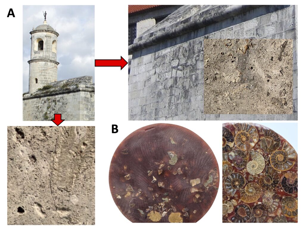 Fósiles marinos. (A) En los muros de piedra caliza en el Castillo de la Real Fuerza con La Giraldilla de La Habana. También presentes en la cercana fachada de la Catedral de San Cristóbal de La Habana en la Plaza de la Catedral de La Habana, oficialmente conocida como la Santa Metropolitana Iglesia Catedral de la Inmaculada Concepción de la Santísima Virgen María. (B). Fósiles amonitas procedentes de la KGJ Colección, Ciudad Real, España.