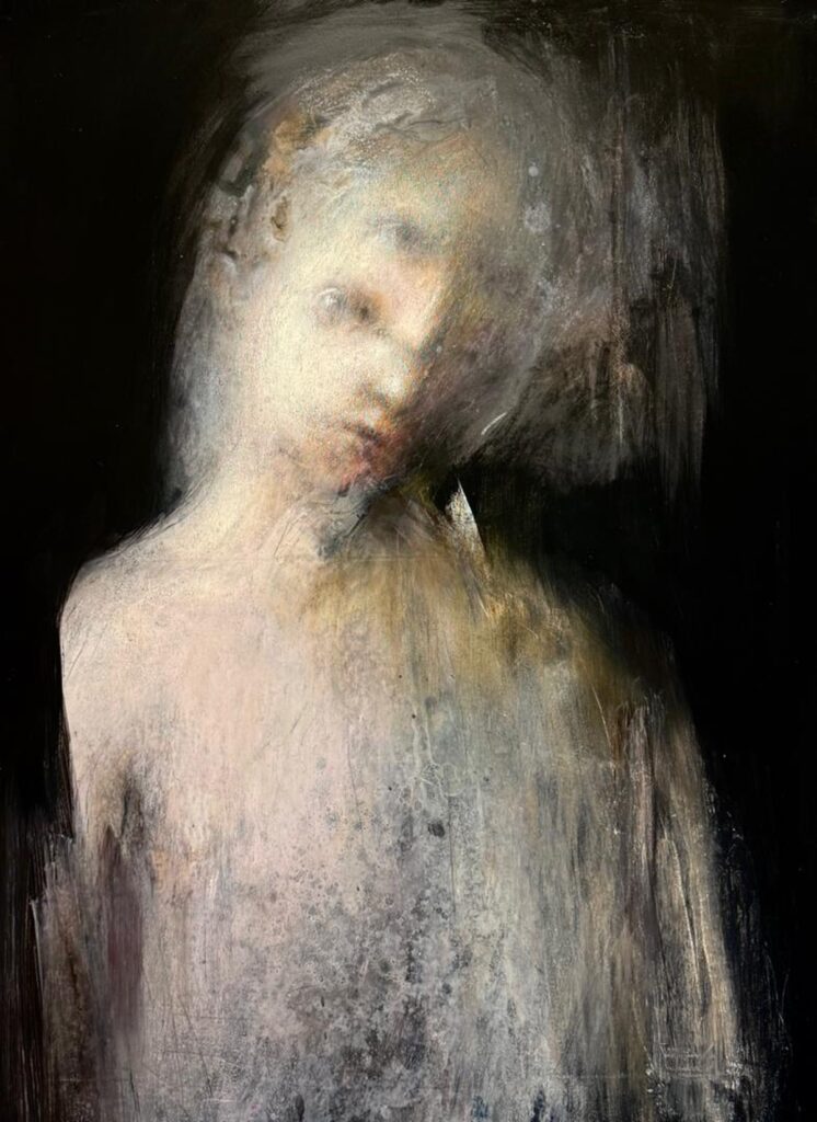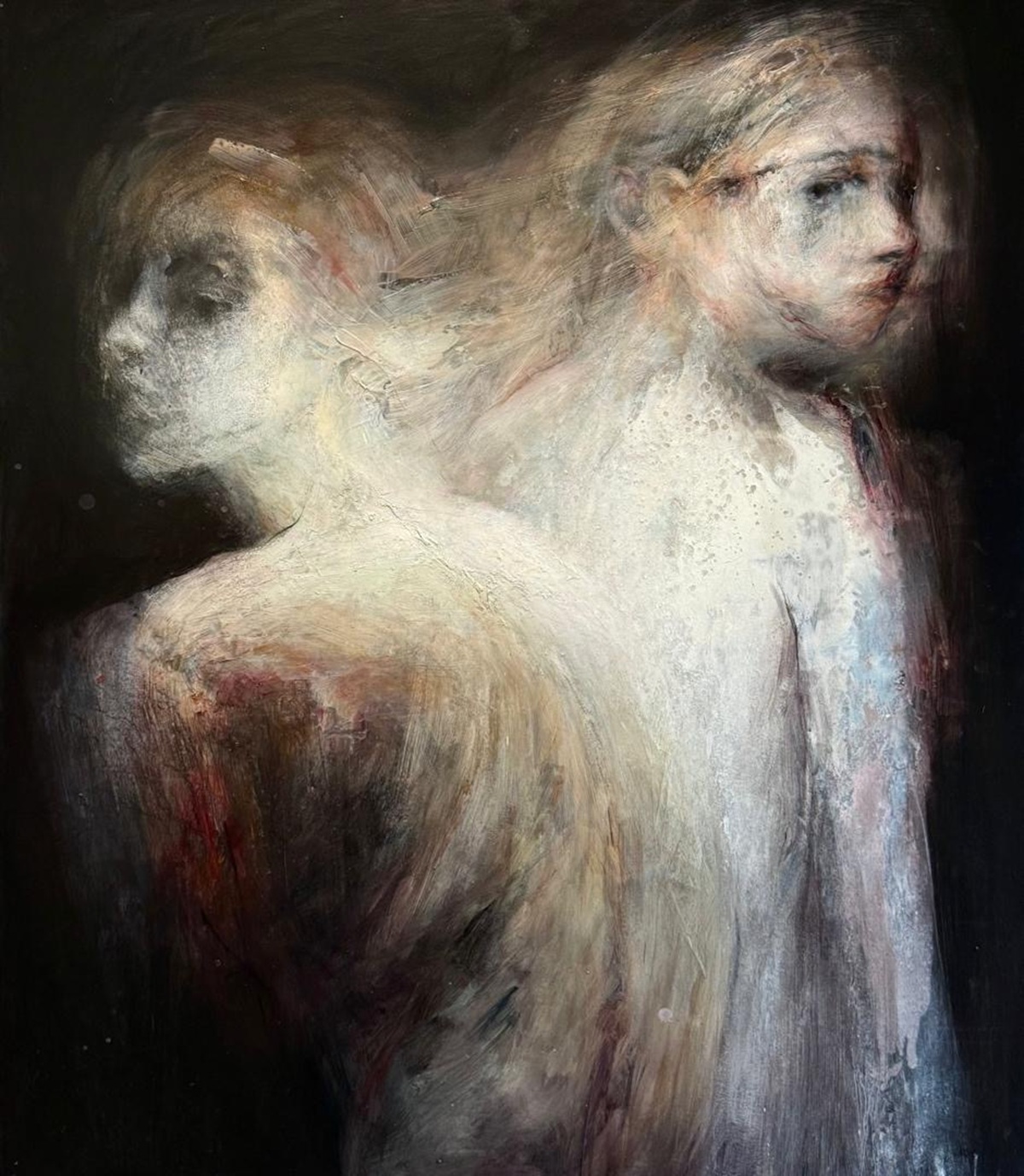 Más que todo ello, su paleta descansa sobre algo que me gustaría nombrar como la dialéctica del duelo. Hablo de esa relación con lo mórbido y los cuerpos en disenso, con la idea de finitud y de despedida. Hablo de esa captura permanente (e insistente) de un instante de fuga hacia un posible sitio despejado de asideros concretos e inasibles.