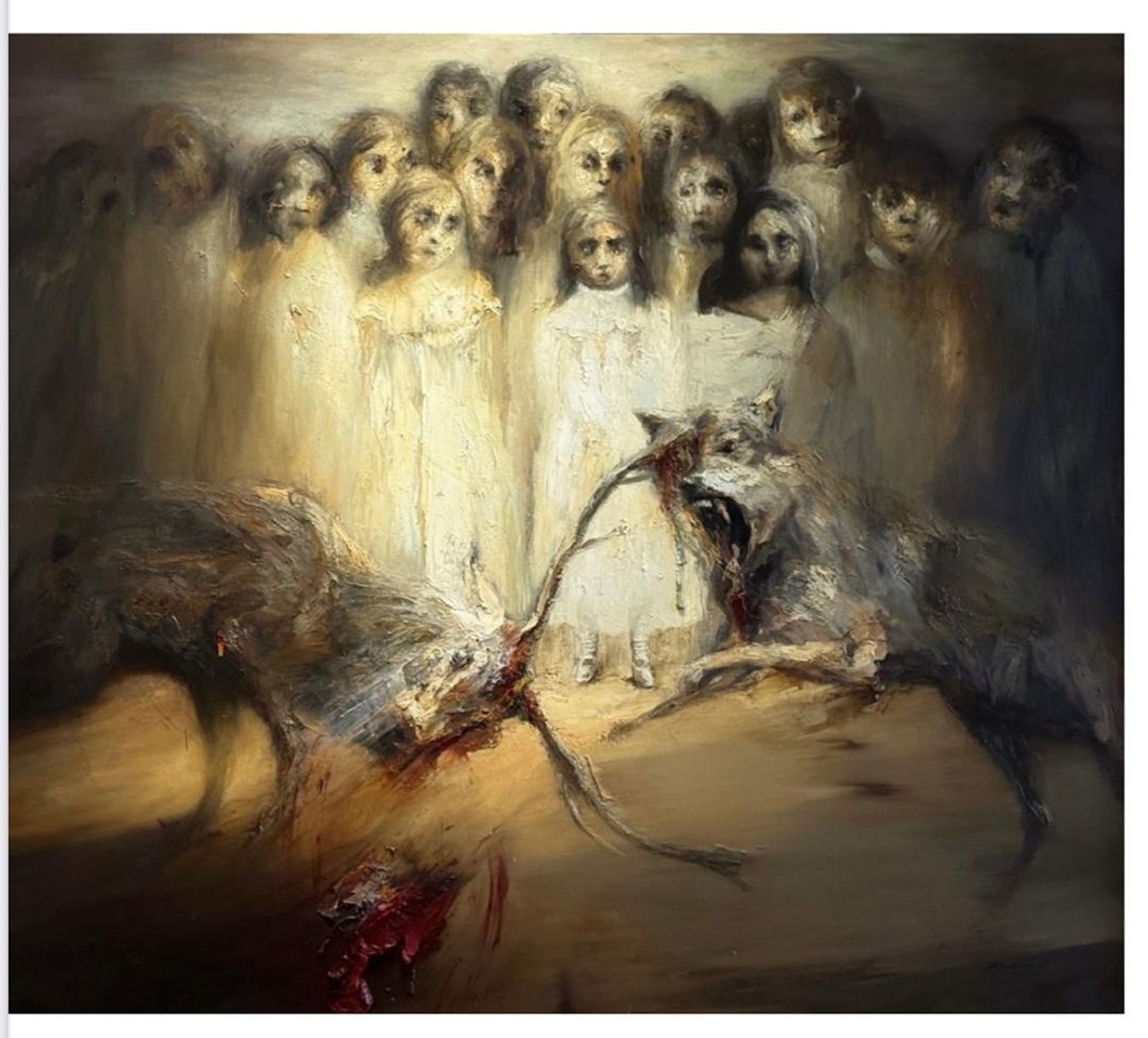 Pareciera como si la acción de la obra tuviera lugar en la mente y en la memoria disuadida. La apariencia de su pintura certifica la localización expedita de un escenario interior atemporal e inespacial, que subvierte la hegemonía de cualquier principio de realidad. Esto último imprime una poderosa carga al contexto de la imagen y permite que circulen en su fuero interno los cadáveres mordidos por las bestias que los acompañan y asedian.