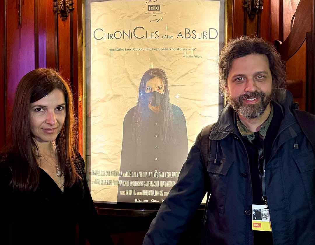 Lynn Cruz y Miguel Coyula ante el cartel de Crónicas del absurdo.