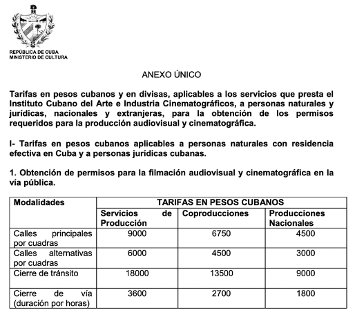 El 1 de enero de 2026 comenzó a aplicarse en Cuba un nuevo esquema de cobros asociado a la obtención de permisos para filmar en espacios públicos, entre otros trámites vinculados a la producción audiovisual y cinematográfica. Según la Resolución 61 del Ministro de Cultura, se trata de una norma administrativa ministerial que aprueba tarifas aplicables a “los servicios que presta el Instituto Cubano de Arte e Industria Cinematográficas” para personas naturales y jurídicas (nacionales o extranjeras), en pesos cubanos (CUP) o en divisas. Entre sus fundamentos principales se encuentran:
