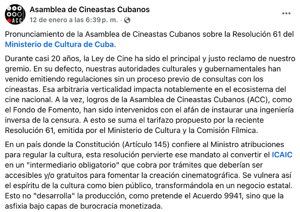 En primer lugar, debemos partir de la reacción visible de cineastas, espacios gremiales y medios culturales del país que detonó esta medida en los días subsiguientes. La principal crítica fue la monetización condicionada del acceso al espacio público, con impactos asimétricos sobre creadores, documentalistas y estudiantes, de dentro o fuera de Cuba, independientes o con vínculos oficiales. Por ejemplo, la Asamblea de Cineastas Cubanos (ACC) publicó un pronunciamiento en sus redes denunciando que el nuevo sistema tarifario “convierte filmar en un privilegio” y opera como mecanismo de “censura” económica. A esta observación, se le unen dos reclamos históricos: la ausencia de una Ley de Cine discutida y consensuada; y su sustitución por regulaciones verticalistas y parciales, sin consulta sustantiva al gremio.