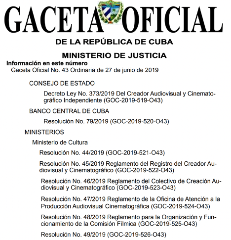 Para comprender el alcance real de la Resolución 61, conviene situarla en un marco normativo anterior. En 2019, la Gaceta Oficial no. 43 publicó un paquete de regulaciones que incluyó el Decreto‑Ley 373/2019 “Del creador audiovisual y cinematográfico independiente” y varias resoluciones del Ministerio de Cultura que regulaban el Registro del Creador, la Oficina de Atención a la Producción y el funcionamiento de la Comisión Fílmica, con un enfoque explícito en la “promoción” de Cuba como destino y el control organizativo del ecosistema.
