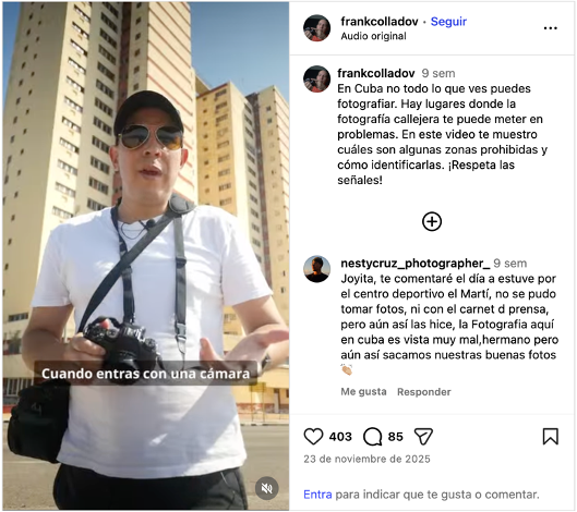 Captura de post sobre experiencias de un fotógrafo profesional tomando imágenes en sitios públicos en Cuba. Fuente: Instagram de frankcolladov (2025).