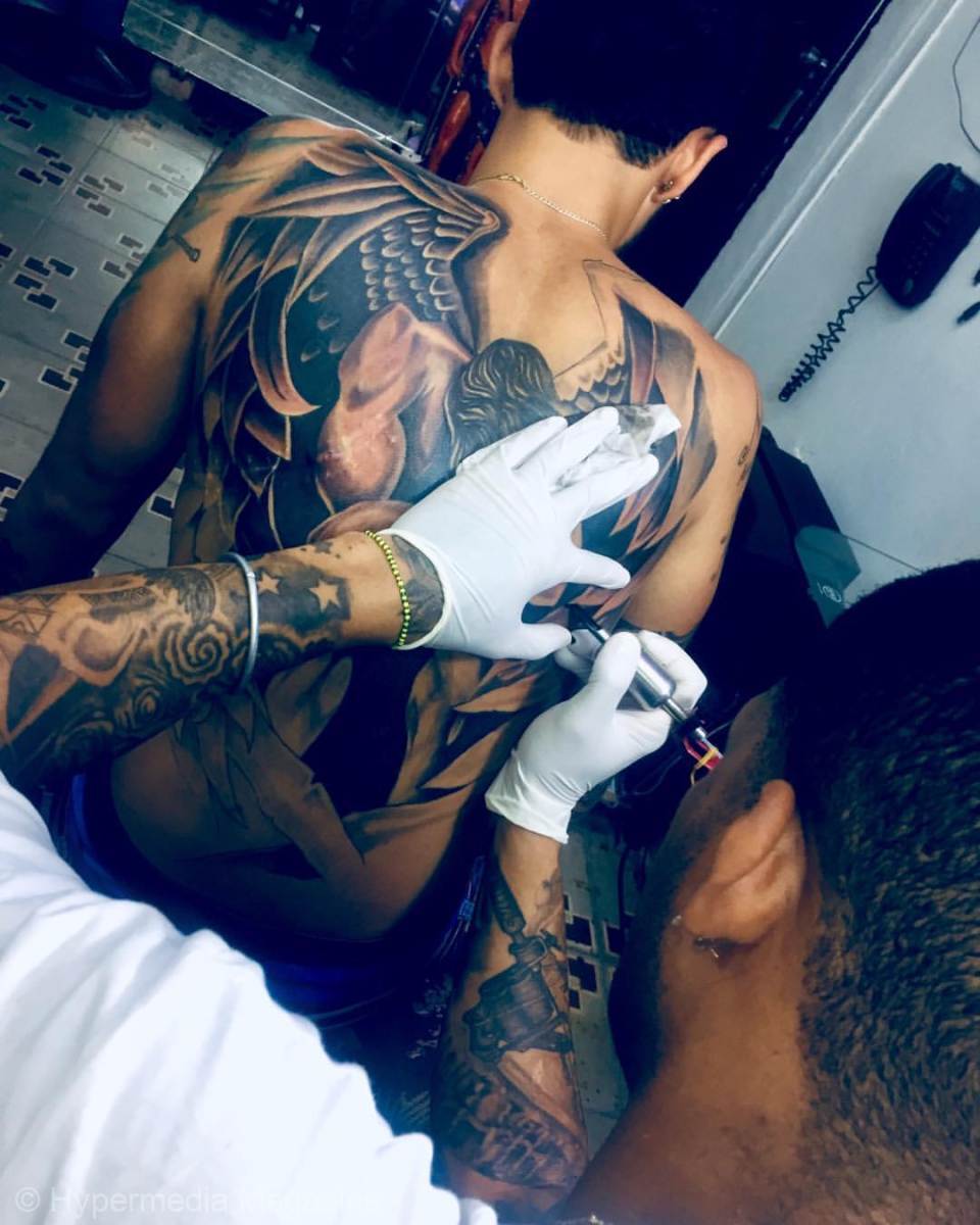 Lo hacía al principio y lo estuve hacienda hasta hace unos añitos atrás. Era un “corte y pega”, como le decimos nosotros. Venía un cliente con una idea o con un tatuaje y yo como artista trataba de replicarlo. Todos los tatuadores pasan por eso. Como todo en la vida, uno va evolucionando. Hay un momento en el que ya uno ya no quiere hacer un “corte y pega”. Sales a la calle, ves a un fulano y dices: “Coñó, ese tatuaje yo lo hice anteayer”. Caminas tres cuadras y ves a otro que tiene el mismo tatuaje que acabas de ver hace un rato; sigues caminando y es lo mismo y lo mismo. Llega el momento en que quieres que el cliente tenga algo tuyo. Ahí empieza uno a preocuparse por eso.