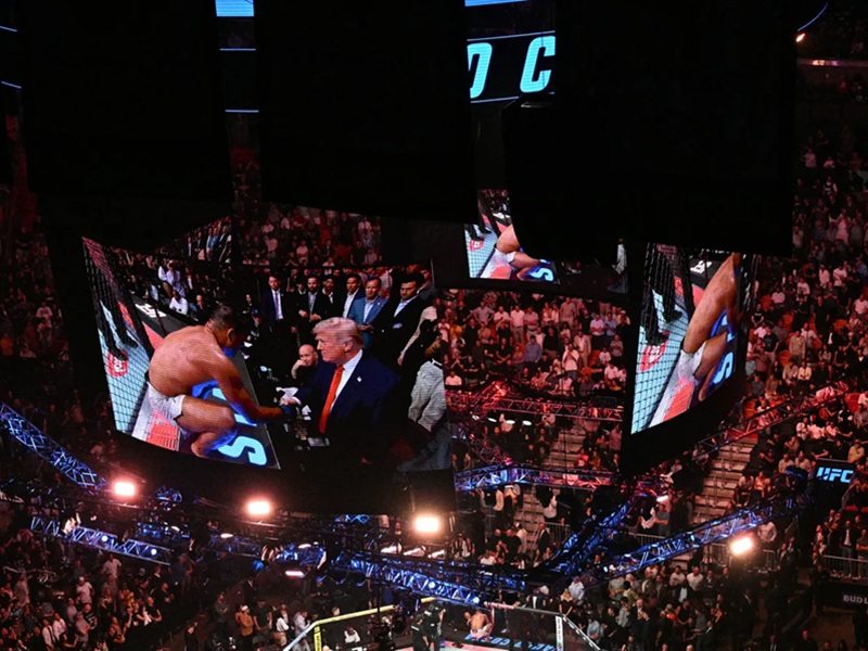 El presidente de Estados Unidos llega al centro de la arena acompañado de Dana White, el presidente de la UFC. Estrecha la mano de mucha gente. Sonrisa de oreja a oreja. Le da la mano a los comentaristas de la transmisión en inglés. Le da la mano al podcaster Joe Rogan.