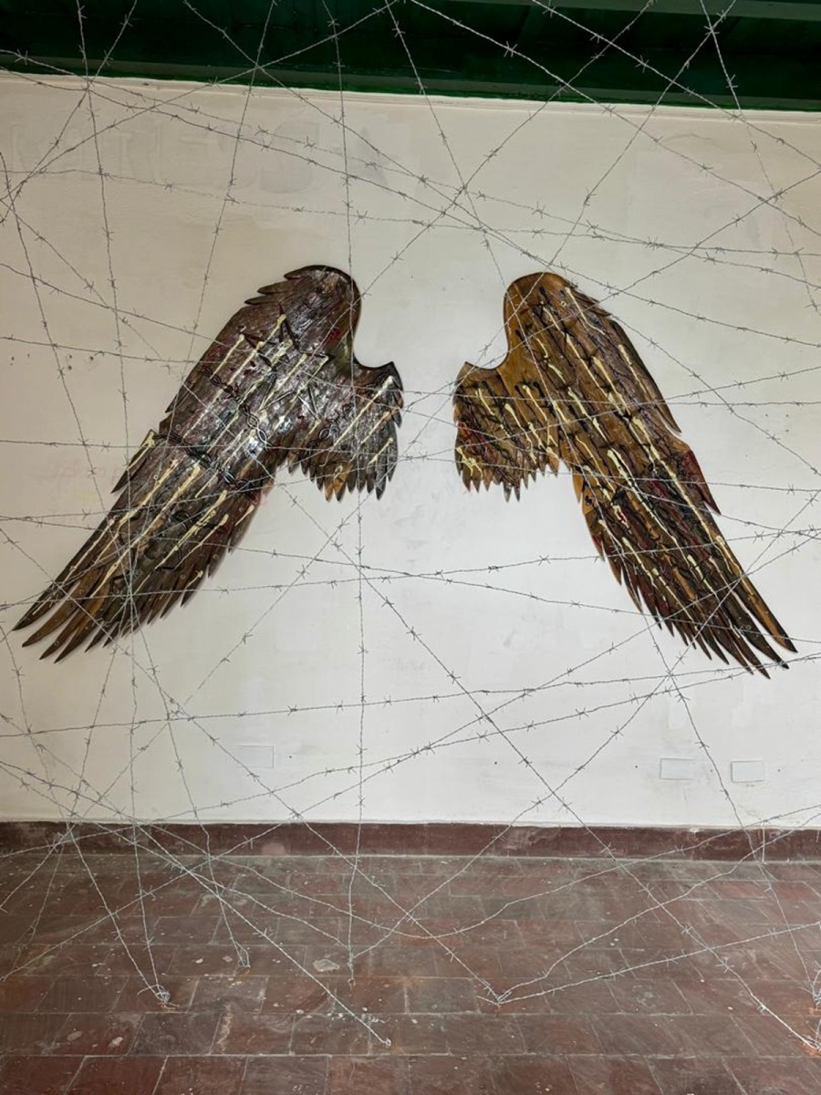 Compuesta por dos grandes alas exentas, adosadas al muro, y un metro y medio de un enorme enjambre de alambre de púas que nos no permiten llegar a ellas, la pieza moviliza un sinnúmero de preguntas. ¿Y para qué sirve el arte, si no es para interrogar la realidad y ponerla en jaque?