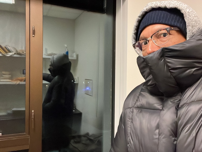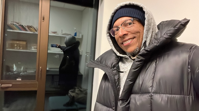 Tras la charla, la cámara del iPhone registra dos extrañas selfis. Dos autofotos, piensa Ahmel. Es la imagen doble de Ahmel, el graduate student, el teaching assistant en el campus a las 5:30 y ya es de noche. Tras la ventana de la oficina se extiende casi gélida la “unánime noche” de Storrs.