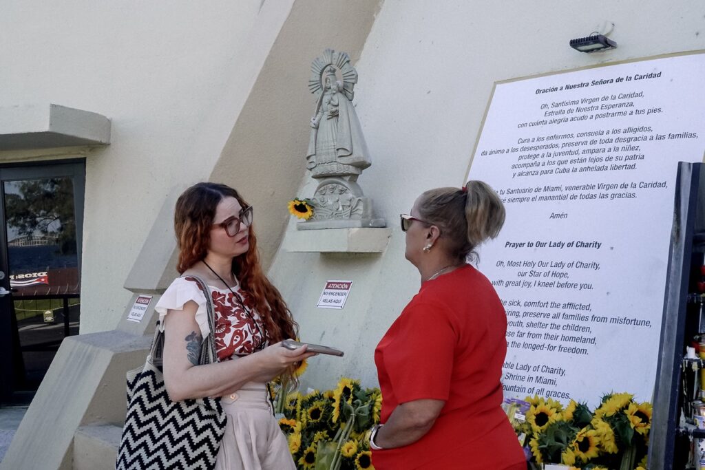 Salimos por la puerta del Santísimo y Carla se detuvo ante el lugar donde la Virgen recibe las ofrendas. Una señora, vestida con un scrub de enfermera, encendía unas velas y Carla le preguntó si era cubana. La entrevistó allí mismo. Luego se acercó a una pareja de cubanos que contemplaban el mar y también habló con ellos. Les preguntó sobre Cuba, cómo valoraban las medidas de Trump. La señora se despidió con un “nos vemos en Cuba libre”.