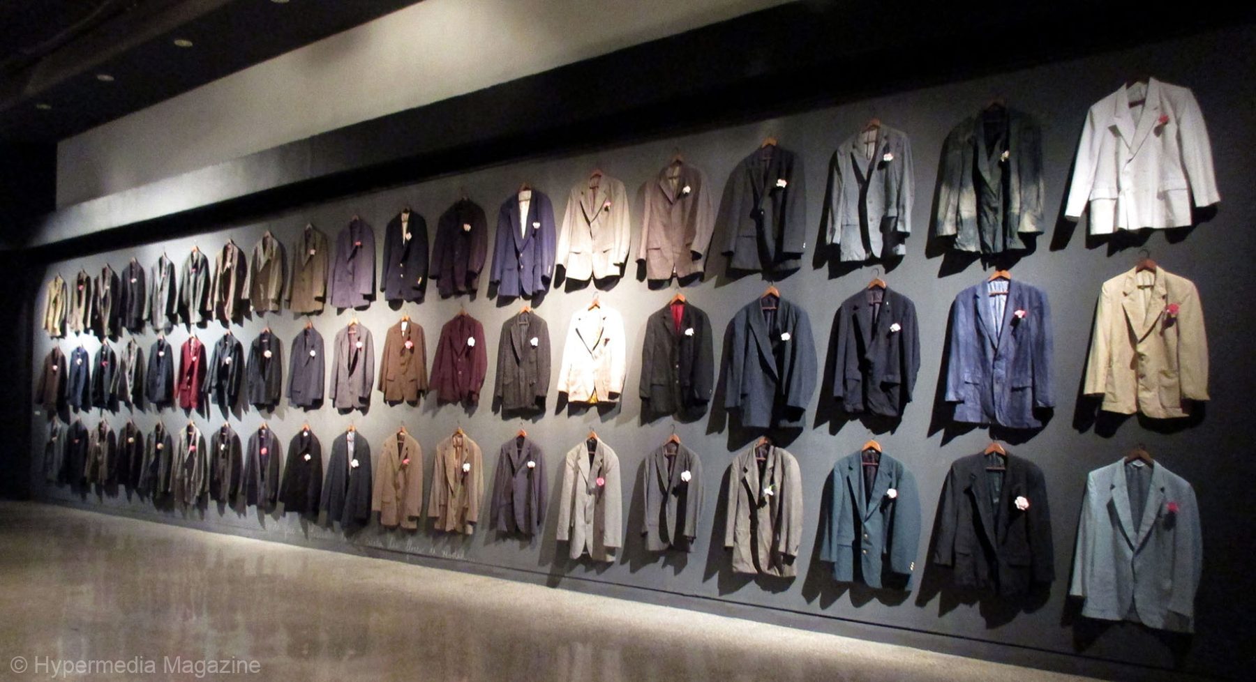 Me dijiste que me traerías a donde crecen las flores de verdad, Instalación, Sacos de trajes masculinos y flores naturales, 2015.