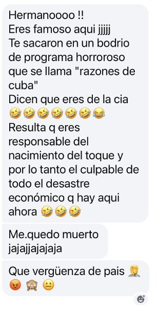 “Te sacaron en un bodrio de programa horroroso que se llama ‘razones de cuba’. Dicen que eres de la cia 🤣🤣🤣🤣🤣🤣😂”.
