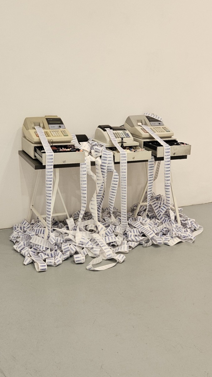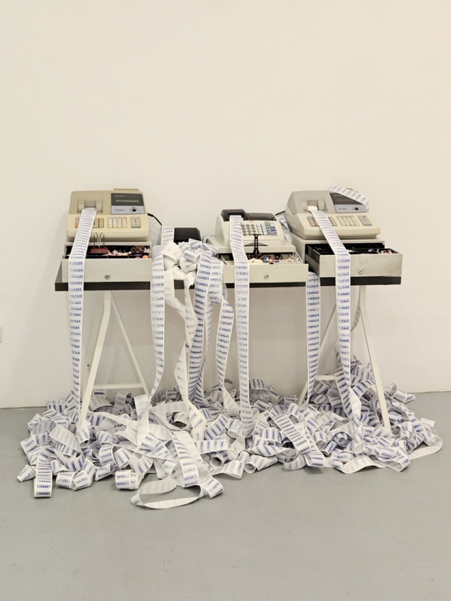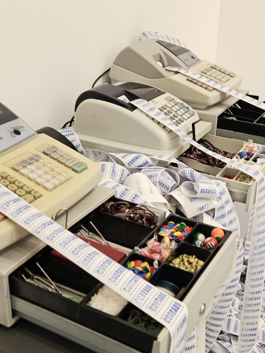 Una de ellas lleva por título “Compro oro”. Es una obra instalativa con múltiples capas de significación que exploran ejes tan disímiles como el aprendizaje en Cuba de la historia común con España (siempre atravesada por los ecos de la llamada “leyenda negra”); el recuerdo de las Casas del Oro y la Plata creadas en Cuba a finales de los años ’80 del pasado siglo —donde se intercambiaban metales nobles por equipos electrodomésticos—; y finalmente, mi propia posición como migrante que intenta insertarse en un mercado laboral saturado y de difícil acceso.