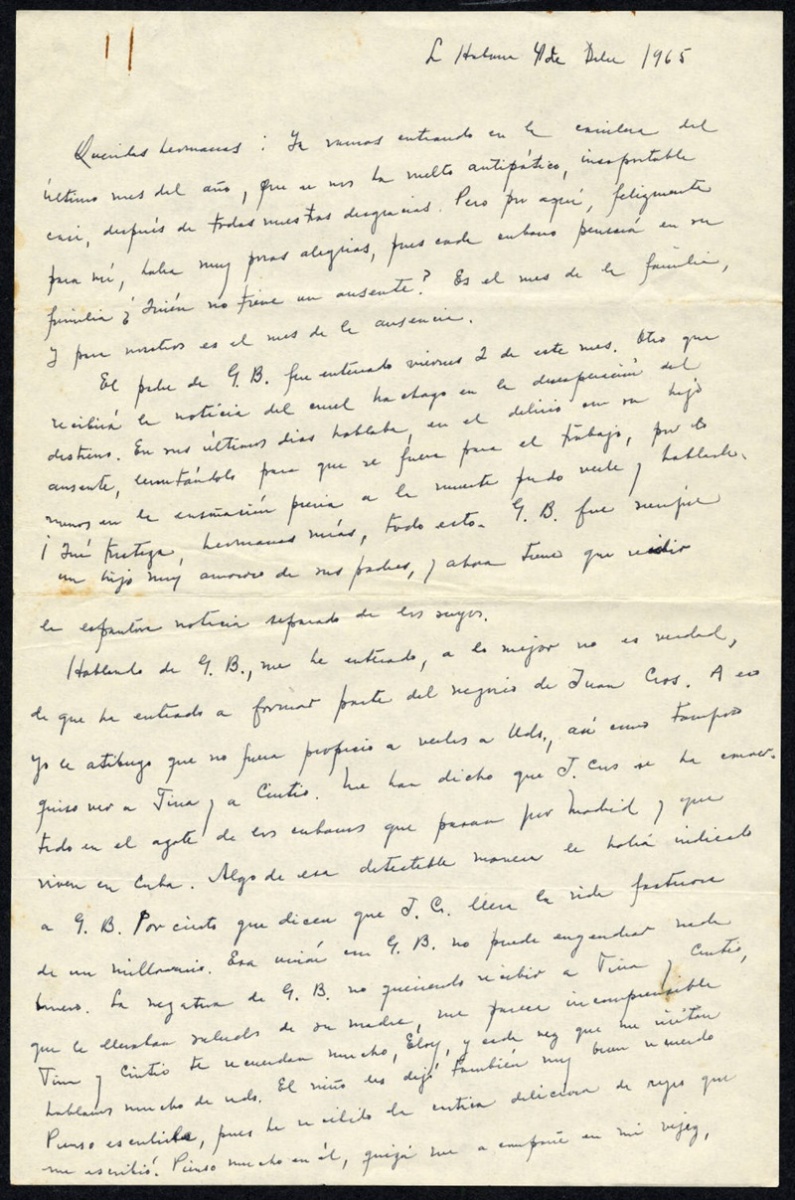 Queridas hermanas: Ya vamos entrando en la carrilera del último mes del año, que se nos ha vuelto antipático, insoportable casi, después de todas nuestras desgracias. Pero por aquí, felizmente para mí, habrá muy pocas alegrías, pues cada cubano pensará en su familia. ¿Quién no tiene un ausente? Es el mes de la familia, y para nosotros es el mes de la ausencia.