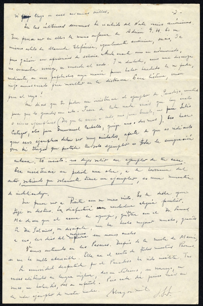 Me dices que te piden con insistencia el ejemplar de Paradiso, remitido para que lo guardes con celo. Fuera de Cuba nada más que hay cuatro o cinco ejemplares (dos que le envié a Uds, uno para Ernesto, uno para Julio Cortázar, otro para Emmanuel Carballo, quizá uno o dos más). Eso hace que esos ejemplares deban ser muy cuidados, aparte de que es ridículo que tú tengas que prestarle tu solo ejemplar a toda la emigración cubana. Te insisto: no dejes salir ese ejemplar de tu casa. Esa insistencia en pedirle una obra, a la hermana del autor, sabiendo que solamente tiene un ejemplar, es una muestra de indelicadeza.