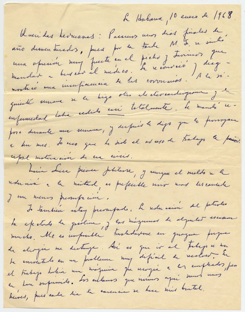 Queridas hermanas: Pasamos unos días finales de año desventurados, pues por la tarde M. L. se sintió una opresión muy fuerte en el pecho y tuvimos que mandar a buscar al médico. La reconoció y diagnosticó una insuficiencia de las coronarias. A la siguiente semana se le hizo otro electrocardiograma y la enfermedad había cedido casi totalmente. [1] Le mandó reposo durante una semana, y después le dijo que lo prorrogara a un mes. Yo creo que ha sido el exceso de trabajo la principal motivación de esa crisis.