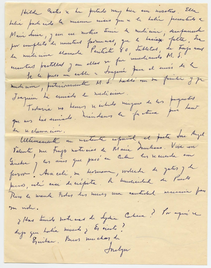 Hilda Castro se ha portado muy bien con nosotros. Ella había padecido la misma crisis que se le había presentado a María Luisa, y con ese motivo tenía la medicina, desaparecida por completo de nuestras farmacias, que le hacía falta. Era la medicina llamada Peritite 80, tabletas, le trajo unas cuantas pastillas y con ellas se fue remediando M. L.