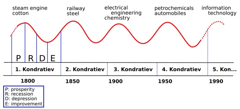 Propuestos por el economista soviético Nikolái Kondrátiev, los largos ciclos económicos son patrones mediante los cuales la economía-mundo experimenta picos y valles, culminando en ondas Kondrátiev o K-waves de aproximadamente 50 años.