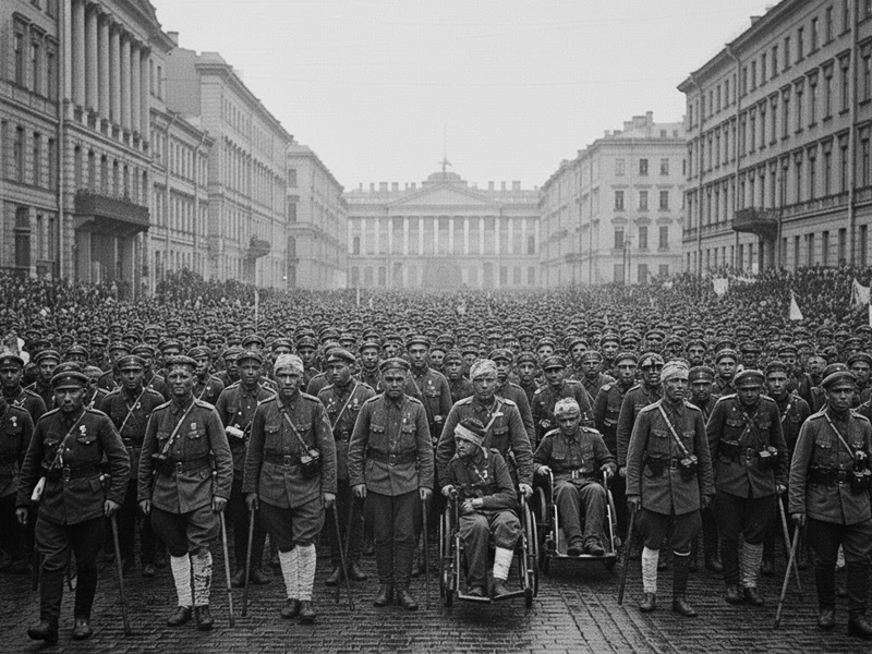 En la Perspectiva Nevski lo sorprendería una manifestación monstruosa en su contra. Literalmente, monstruosa. Y no sólo por el número de manifestantes. Se trataba de un mar de mutilados de la después llamada “primera guerra mundial”.