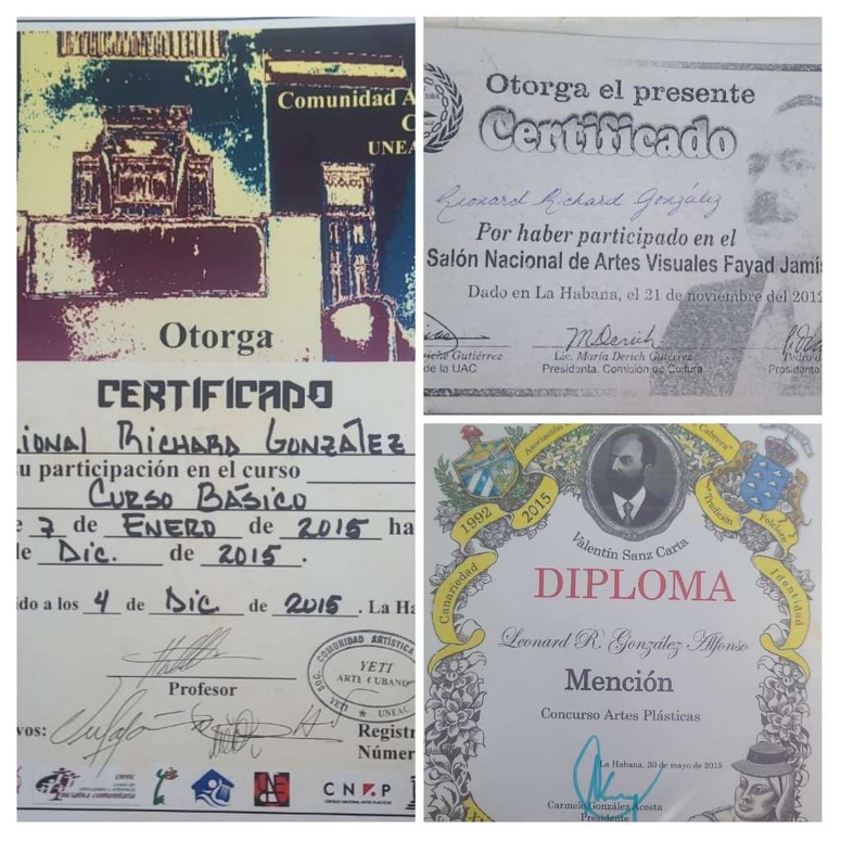 Muestra de certificados obtenidos por Leonard Richard González a lo largo de su carrera artística. Fuente: cortesía de la familia del artista.