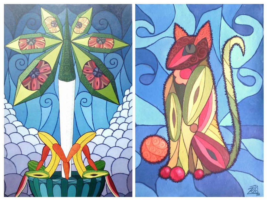 Una primera línea se vincula con ejercicios más clásicos de pintura y dibujo: retratos, escenas cotidianas y composiciones donde se combinan figuras humanas con motivos florales y frutales, con una influencia visible de las segundas vanguardias cubanas y un tono ligeramente naif.