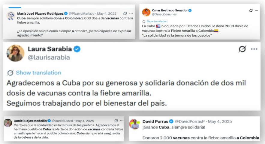 Nota. Publicaciones en X realizadas entre el 4 y 5 de mayo por voceros del gobierno Petro, agradeciendo la donación de 2.000 vacunas de Cuba al país para atender la emergencia de fiebre amarilla.