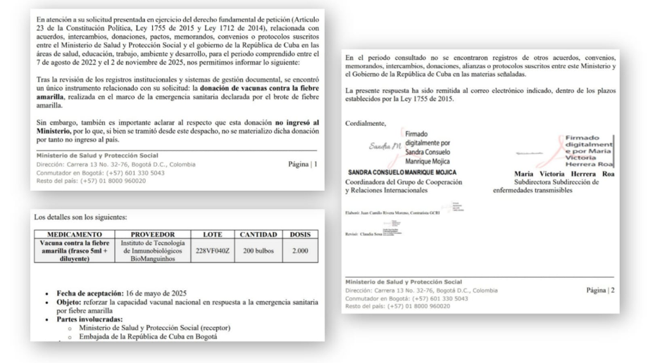 En medio de la emergencia sanitaria que enfrenta el país por el brote de fiebre amarilla, el gobierno Petro y el régimen de Cuba anunciaron públicamente la donación de 2000 vacunas al país. La noticia fue ampliamente difundida en la prensa nacional y los medios oficiales cubanos, destacando que fue un gesto de solidaridad internacional y fortalecimiento de las relaciones bilaterales entre ambos países. No obstante, al indagar por los acuerdos, intercambios, pactos, memorandos, protocolos y donaciones entre el Ministerio de Salud y Protección Social y la República de Cuba, mediante derecho de petición, MinSalud informó que la donación no se materializó y nunca ingresó al país.