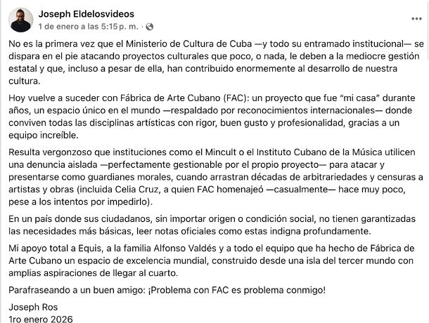 El incidente también tuvo eco desde las instituciones culturales del Estado cubano. El Instituto Cubano de la Música, por ejemplo, emitió el 31 de diciembre una nota oficial, luego difundida por medios estatales como Cubadebate y Granma, en la que reconocía un “mal manejo del derecho de admisión” en FAC, exigiendo medidas disciplinarias contra el trabajador implicado, tras asegurar que investigaría el caso.