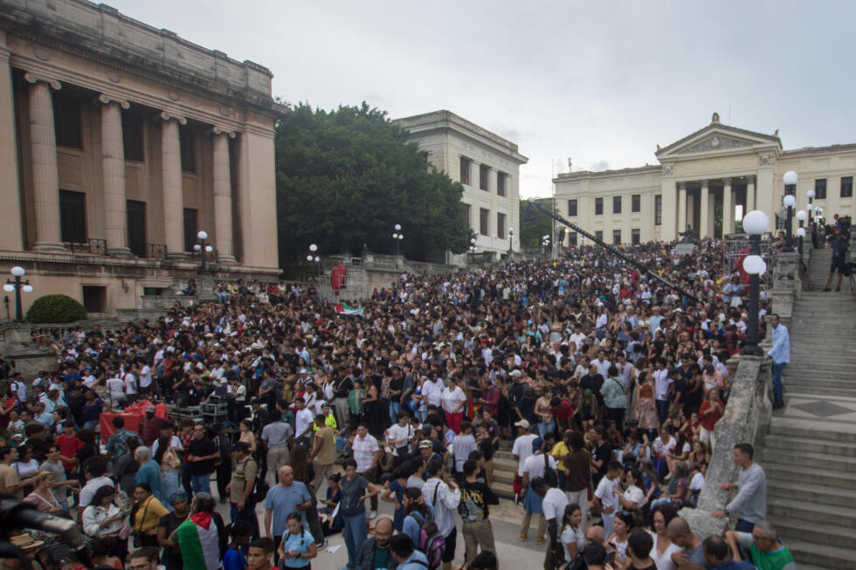 4. En septiembre de 2025, el concierto “masivo” de Silvio Rodríguez fue organizado supuestamente para los estudiantes universitarios que habrían protestado por las políticas extractivistas de la empresa de telecomunicaciones ETECSA. Sin embargo, en medio de una de las crisis energéticas más profundas del país y mientras la mayor parte de la capital permanecía a oscuras, el escenario se dispuso de cara a la escalinata universitaria dando la espalda al resto del espacio público. En paralelo, se desplegó un amplio operativo policial que bloqueó accesos al campus y los asistentes debieron pasar controles de entrada nada habituales para este tipo de presentaciones “públicas”.